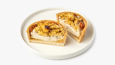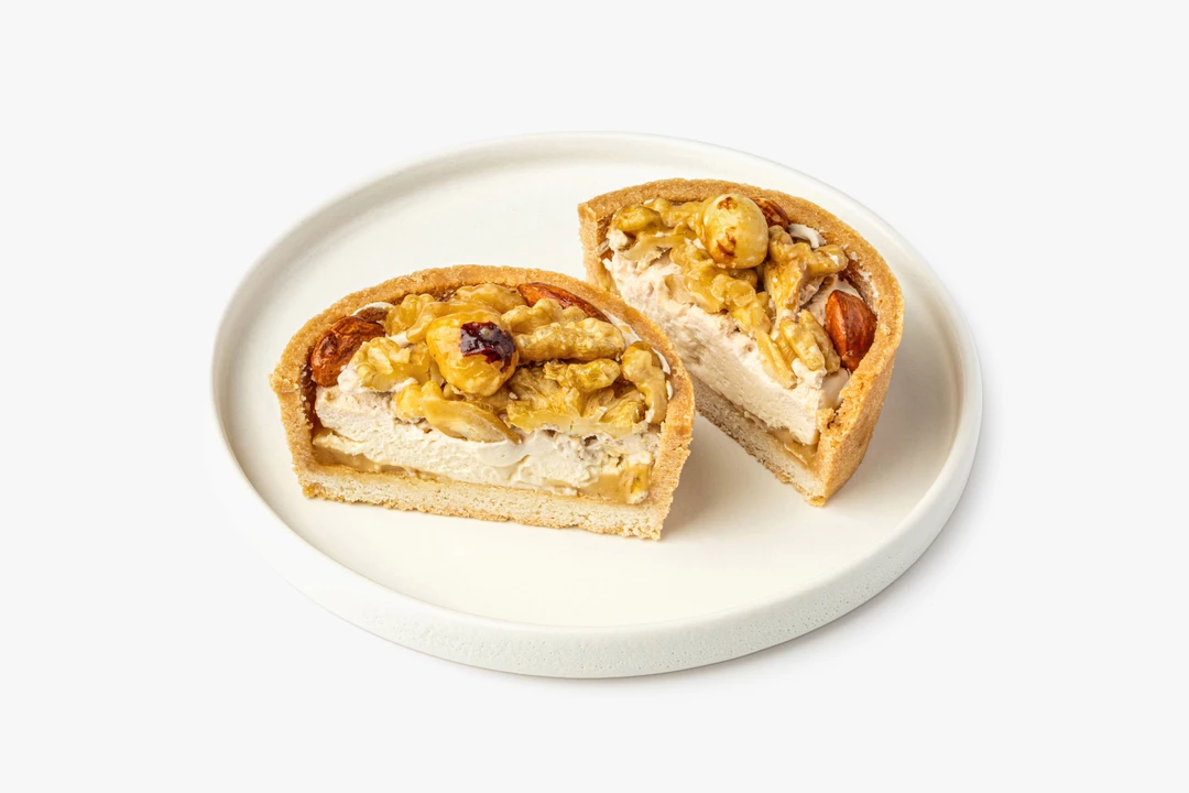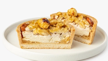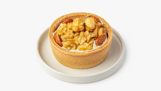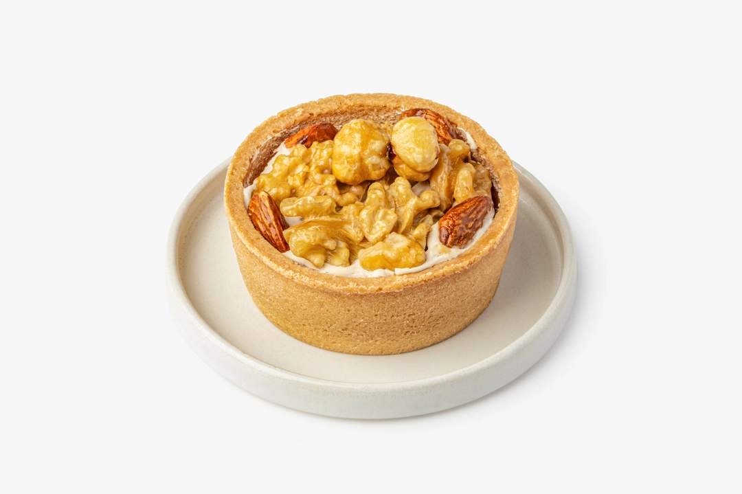Рассыпчатая тарталетка с нежным кремом, тягучей карамелью и глазированными хрустящими орехами: грецкими, фундуком и миндалём. Тесто изготовлено из безглютеновой муки: рисовой и кукурузной. Место коровьего молока заняло кокосовое. А за сладость отвечает сироп топинамбура. Так что это лакомство отлично подойдёт людям на безглютеновой диете, веганам, постящимся и всем ценителям полезных десертов.