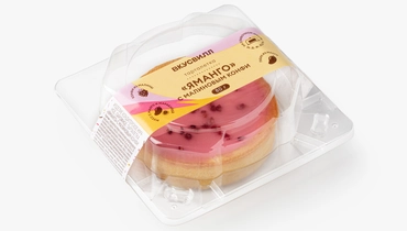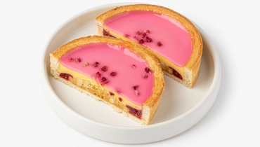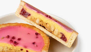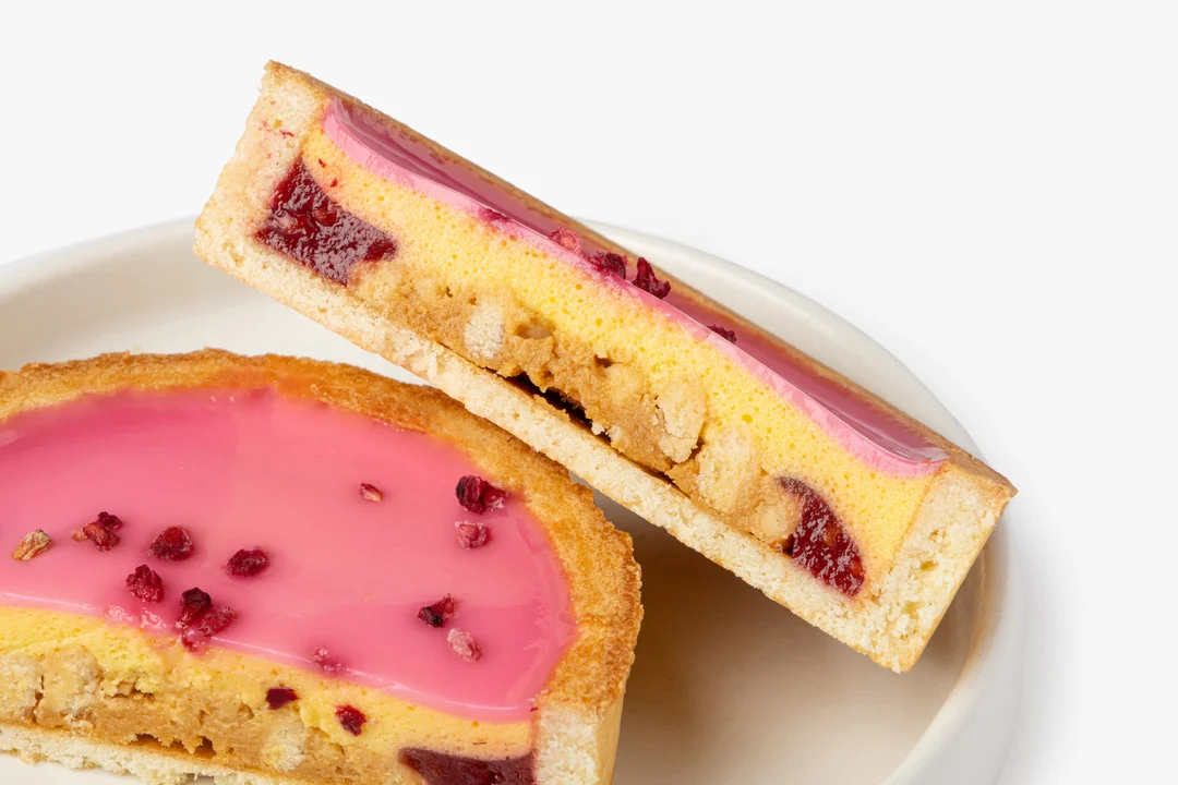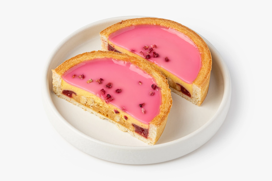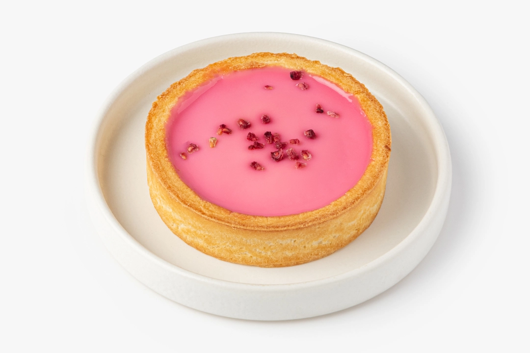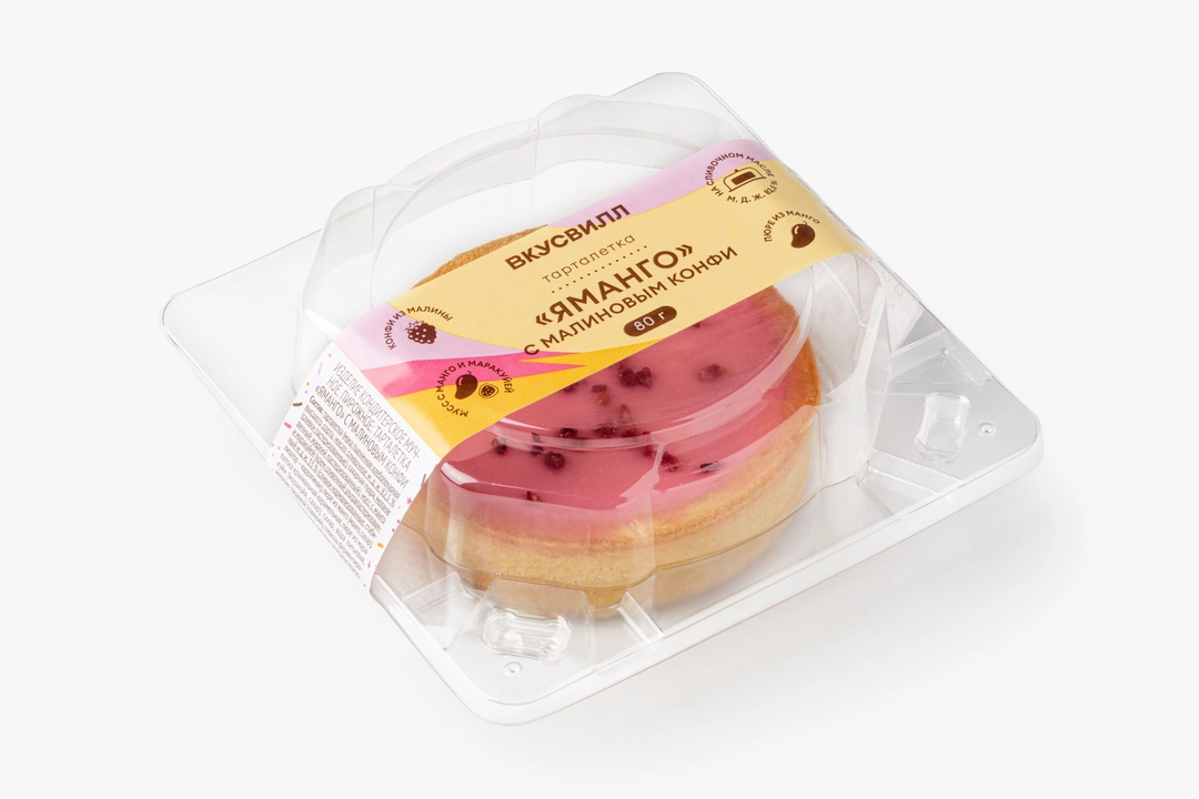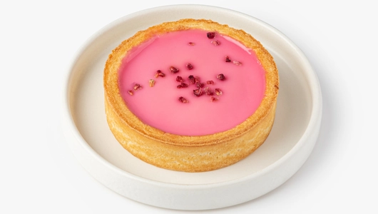 Тарталетка с песочной основой, фруктовым муссом и малиновым конфи. В составе — сливочный мусс с пюре манго и маракуйи, прослойка из малины и покрытие на основе белого шоколада и сливок. Верх украшен сублимированной малиной