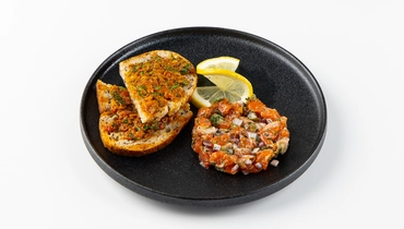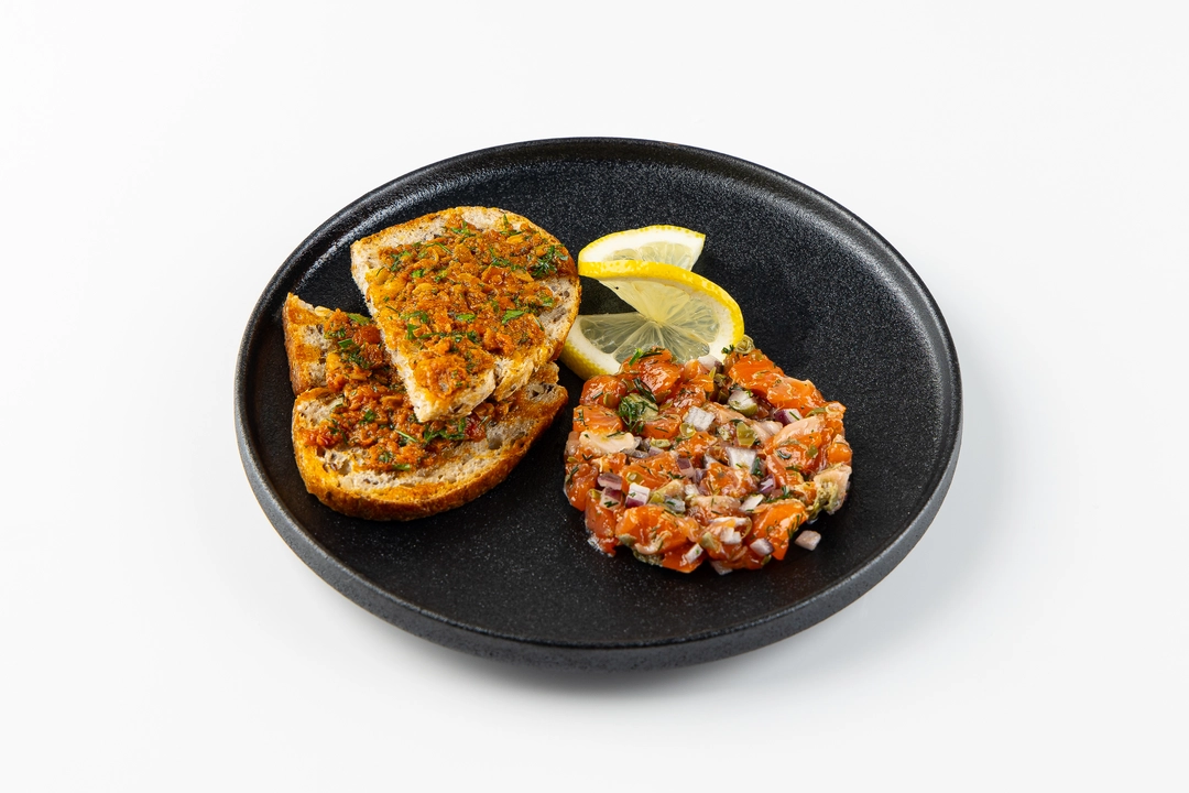 Нежный тартар из слабосолёной форели подан с луком, каперсами и свежим укропом — он получается сочным, с лёгкой пряной кислинкой и выраженным рыбным вкусом. Рядом — поджаренный на гриле ломтик зернового хлеба с брускеттой из вяленых томатов и кешью. Тартин приятно хрустит и служит хорошей основой для рыбы, а дольки лимона можно использовать, чтобы добавить свежий цитрусовый акцент. Такое сочетание выглядит ярко и подходит в качестве закуски перед обедом.