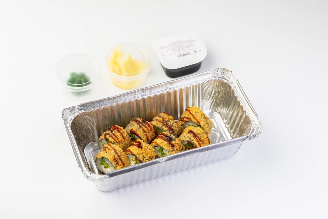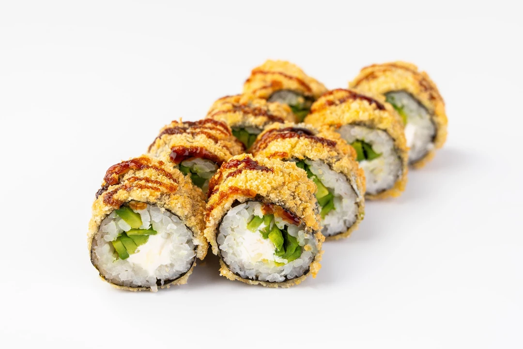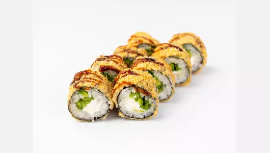 Безупречное сочетание мягкости и хруста. Сердце ролла - тающий творожный сыр и ломтики спелого кремового авокадо, обернутые в благородный рис и лист нори. Золотистая панировка придает блюду аппетитный вид и деликатный хруст. Специальная технология обжарки позволяет сохранить баланс вкуса и плотность текстуры без необходимости горячей подачи. Завершает композицию густая карамельная сладость соуса унаги, которая идеально подчеркивает свежесть авокадо. Комплектуется с соевым соусом, имбирем маринованный и васаби.
