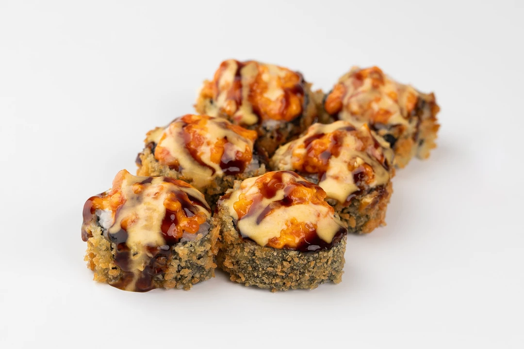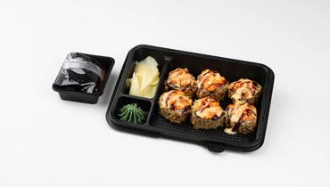 основа (рис для суши (крупа рисовая отварная (вода питьевая, крупа рисовая шлифованная), соус для риса (уксус рисовый (уксус рисовый, уксус спиртовой, вода питьевая, сахар, соль пищевая), сахар, соль пищевая), сыр творожный м.д.ж в сухом веществе 65% (творог (нормализованное пастеризованное молоко, бактериальная закваска, молокосвертывающий фермент микробного происхождения), загуститель- модифицированный крахмал, соль пищевая, стабилизаторы (камедь рожкового дерева, гуаровая камедь), регулятор кислотности - лимонная кислота, вода питьевая), огурец свежий), кляр (мука темпурная (мука пшеничная хлебопекарная высшего сорта, крахмал кукурузный, соль поваренная пищевая, чеснок сушеный молотый, лук репчатый сушеный молотый, разрыхлитель-гидрокарбонат натрия (сода пищевая)), вода питьевая), сухари панировочные (мука пшеничная хлебопекарная высшего сорта, дрожжи сухие хлебопекарные, соль пищевая, сахар), масло фритюрное (масло подсолнечное рафинированное дезодорированное, пеногаситель E900), спайси лосось (лосось атлантический (семга) слабосоленый (лосось атлантический (семга) (продукция аквакультуры, произведено из охлажденного сырья), соль пищевая, сахар), соус спайси (майонез мдж 67% (масло подсолнечное и масло оливковое рафинированное дезодорированное, вода питьевая, сахар, яичный желток жидкий, соль пищевая, лимонный сок прямого отжима, уксус спиртовой 20 %, горчичное масло нерафинированное), соевый соус (вода питьевая, соевые бобы, пшеница, соль, сахар), перец красный молотый)), соус манговый чили (манго пюре замороженное (пюре из манго), соус сладкий Чили (сахар, вода, перец чили 22%, соль, чеснок, загуститель кукурузный крахмал, регулятор кислотности уксусная кислота ледяная, загуститель ксантановая камедь)), соус унаги (вода, сахар, соус соевый (вода, соя, пшеница, соль, мука пшеничная), загуститель модифицированный крахмал, краситель пищевой сахарный колер 1 простой, консервант сорбат калия), водоросли нори сушеные, соус соевый (вода питьевая, соевый соус (вода питьевая, соевые бобы, пшеница, соль, сахар), сахар), имбирь маринованный (корень имбиря свежий, уксус рисовый (уксус рисовый, уксус спиртовой, соль, сахар), соль, сахар), васаби (вода питьевая, васаби порошок (порошок хрена, горчичный порошок, крахмал кукурузный, соль пищевая, антиокислитель-аскорбиновая кислота), порошок спирулины). Продукция производится на предприятии, где используются рыба, моллюски, ракообразные, яйца, молоко, кунжут, сельдерей, орехи, злаки и продукты их переработки. Возможно попадание в продукт фрагментов костей рыбы.