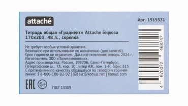 Тетрадь общая Attache Градиент Бирюза - тетрадь формата А5 для ведения записей. Состоит из мягкой картонной обложки (не однотонная) и 48 листов офсетной бумаги. Размер одного листа составляет 17x20,3 сантиметра. Листовая бумага у данной тетради имеет 100% белый цвет при серой линовке 'в клетку' (с полями). Плотность равна 60 граммам/квадратный метр. Листы надежно крепятся с обложкой с помощью скрепок. Тетрадь не имеет перфорации и разделителей. Дизайн тетради Attache Градиент Бирюза выполнен в комбинированном цвете с бирюзовыми оттенками, которые подчеркивают презентабельность и деловой стиль тетради. Она станет идеальным выбором для учебы, офисных будней или же просто как личный ежедневник. Страна производитель-Россия