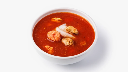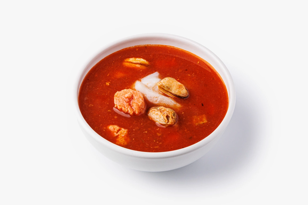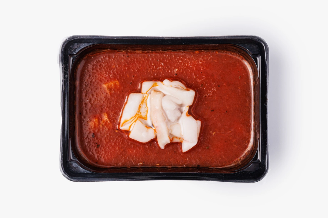 Этот продукт — быстрое и сытное решение для деликатесного обеда или ужина. Мы приготовили суп на бульоне из филе форели и горбуши с мидиями и кальмарами, добавили в него томатную пасту и приправы и бережно заморозили. Он получился наваристым, с лёгким средиземноморским оттенком и ароматом. Полуфабрикат достаточно разогреть любым удобным способом и подать на стол с хрустящими гренками или ломтиками багета. По желанию можно посыпать свежей рубленой зеленью.