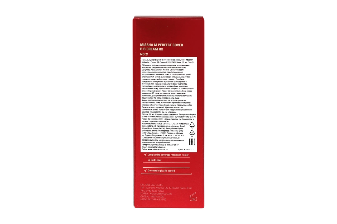 Тональный BB-крем MISSHA (Миша) – самый продаваемый BB-крем в мире. Он превосходно справляется с тремя базовыми функциями BB-средств (Beauty balm, бальзам красоты) – идеальный макияж, инновационный уход за кожей и высокая степень защиты от солнца. С первых дней BB-крем MISSHA получил высокую оценку профессиональных визажистов по всему миру. BB крем MISSHA М Perfect Cover RХ обеспечивает безупречное покрытие и маскирующий эффект, не закупоривая поры. Подстраивается под Ваш естественный тон кожи, скрывая несовершенства и заметно улучшая цвет лица. Уникальные бежевые пигменты подсвечивают кожу изнутри, выравнивают рельеф и создают эффект отдохнувшего лица. Тональный BB-крем обеспечивает стойкое покрытие без жирного блеска в течение 24 часов. Не меняет оттенок в течение дня, не сереет, не тускнеет, не скатывается. Благодаря мягкой кремовой текстуре BB крем MISSHA М Perfect Cover RX легко и быстро наносится, равномерно растушёвывается. Гиалуроновая кислота и керамиды, входящие в состав BB-крема, поддерживают гидролипидный баланс кожи, насыщая её влагой и поддерживая комфортное увлажнение в течение всего дня. Комплекс растительных экстрактов и масел интенсивно питает и увлажняет кожу, а коллаген и пептиды повышают тонус, улучшают текстуру кожи и предотвращают возрастные изменения.