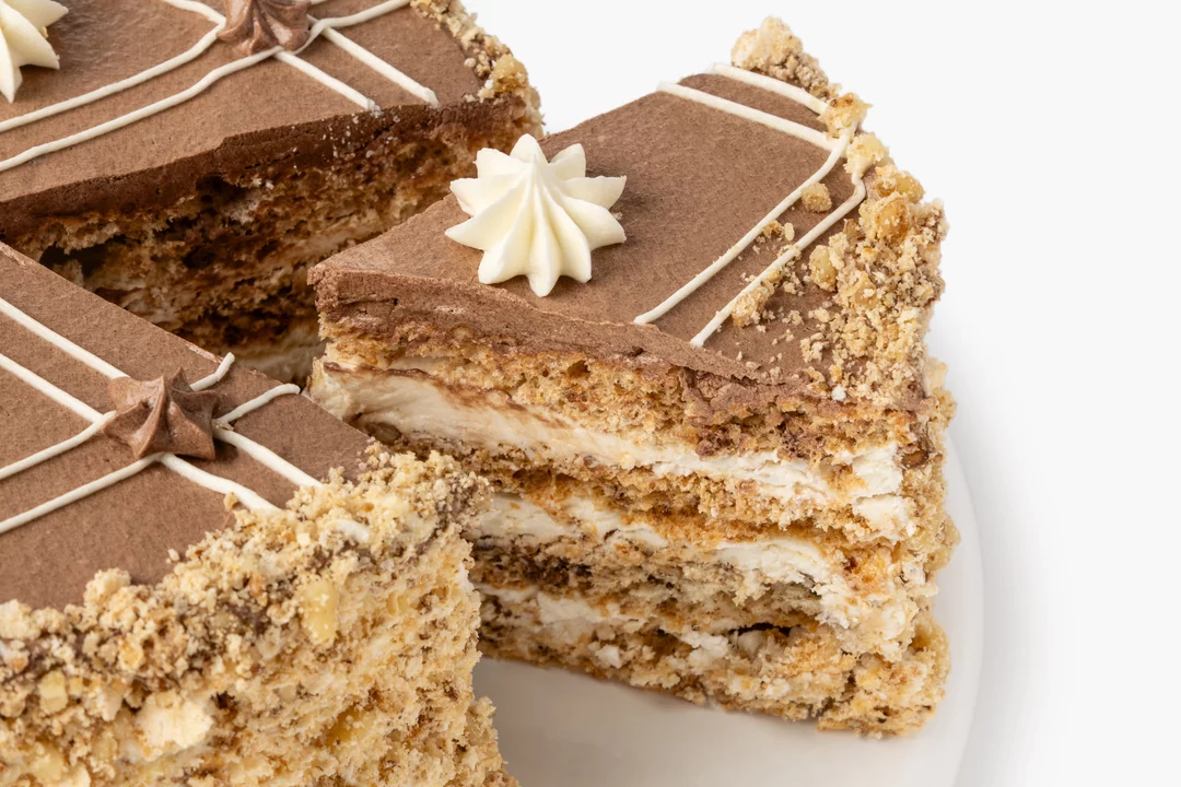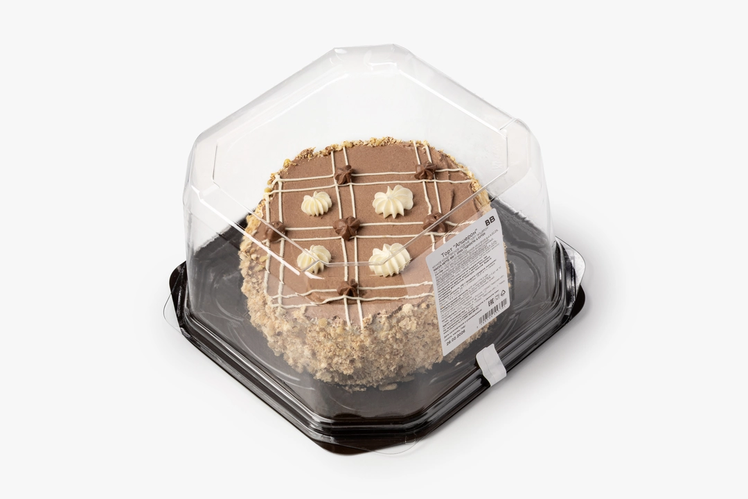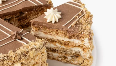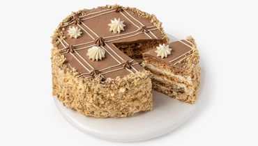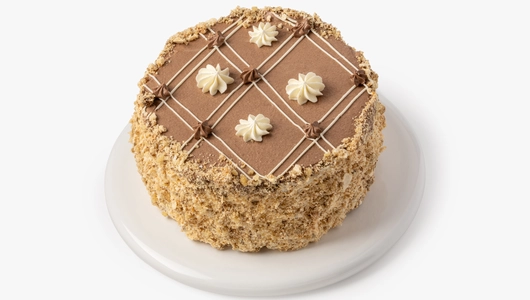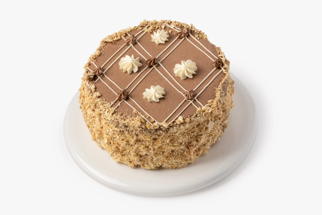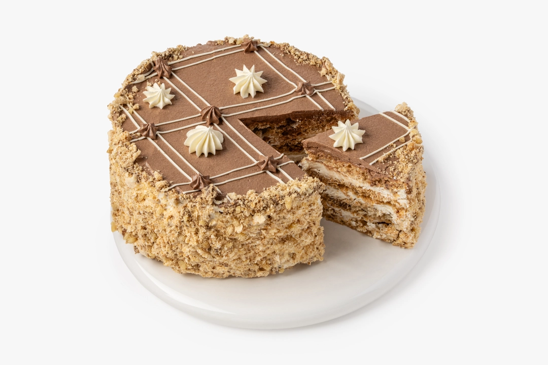 Классический бакинский торт выпечен по традиционному рецепту. Коржи приготовлены на основе взбитых белков с измельчёнными орехами и промазаны заварным кремом на сливочном масле с ванильными нотами.