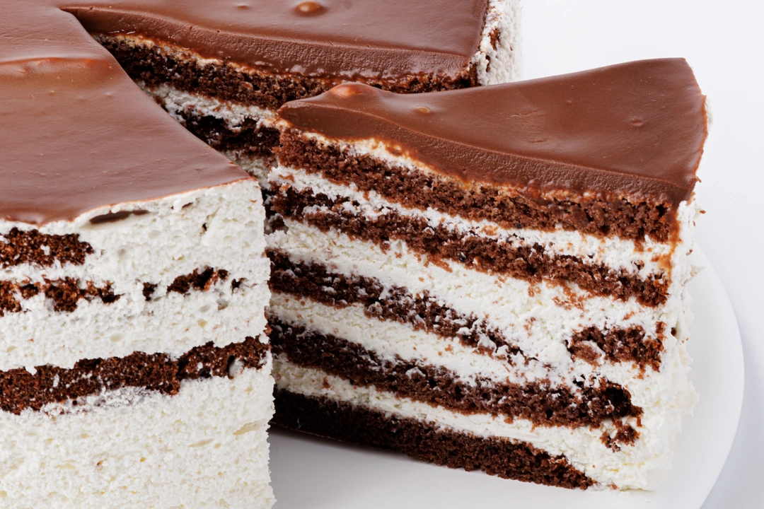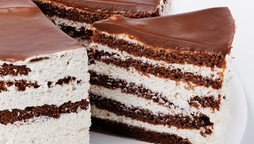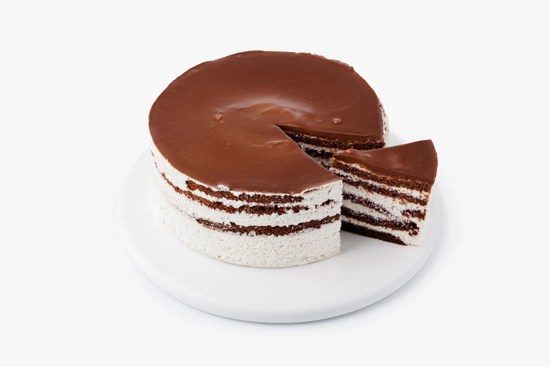 Большой бисквитный торт с шоколадными коржами и нежным сырным кремом. Контраст тёмного бисквита и светлой кремовой прослойки даёт ровный, сбалансированный вкус. Сверху — гладкая шоколадная глазурь. Диаметр торта 18 см.