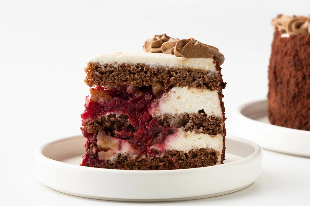 Торт с выразительным шоколадно-вишнёвым вкусом. В его основе нежный бисквит и сметанный крем. Внутри начинка из цельной вишни и грецкого ореха. Снаружи десерт украшен шоколадной посыпкой, а сверху — кремом и шоколадным декором с праздничной надписью.