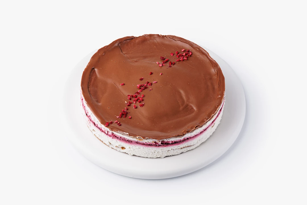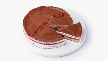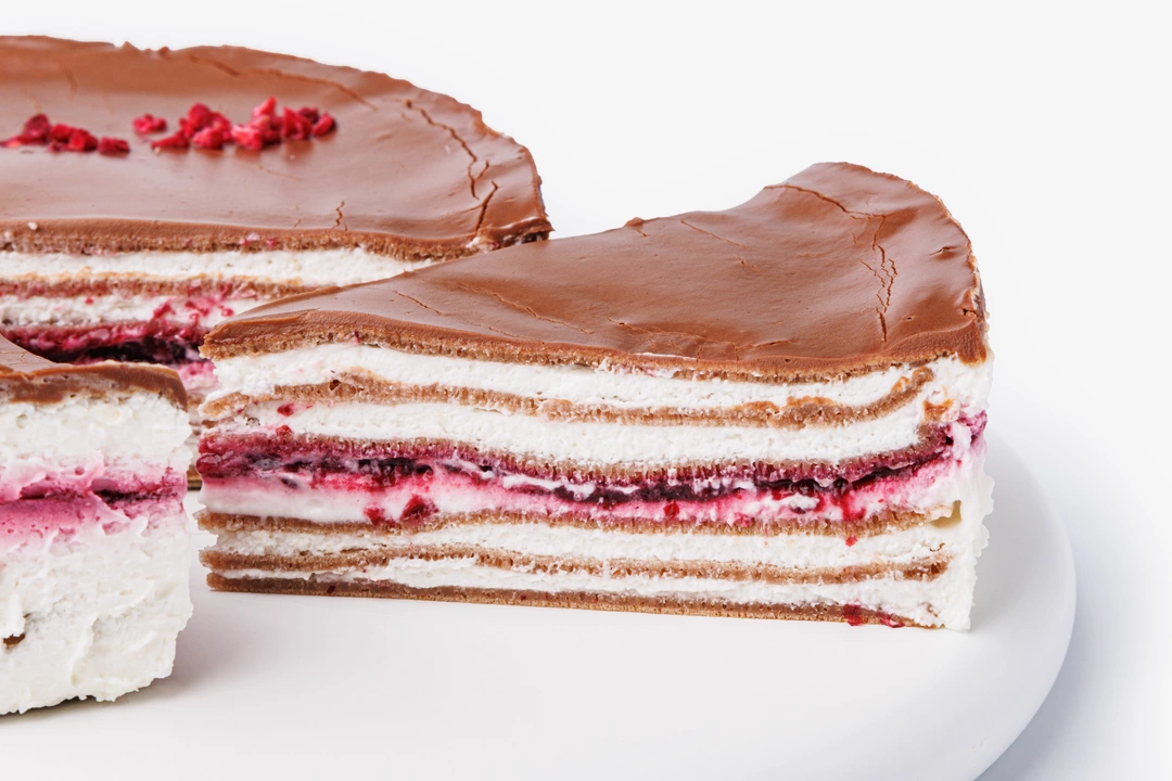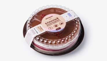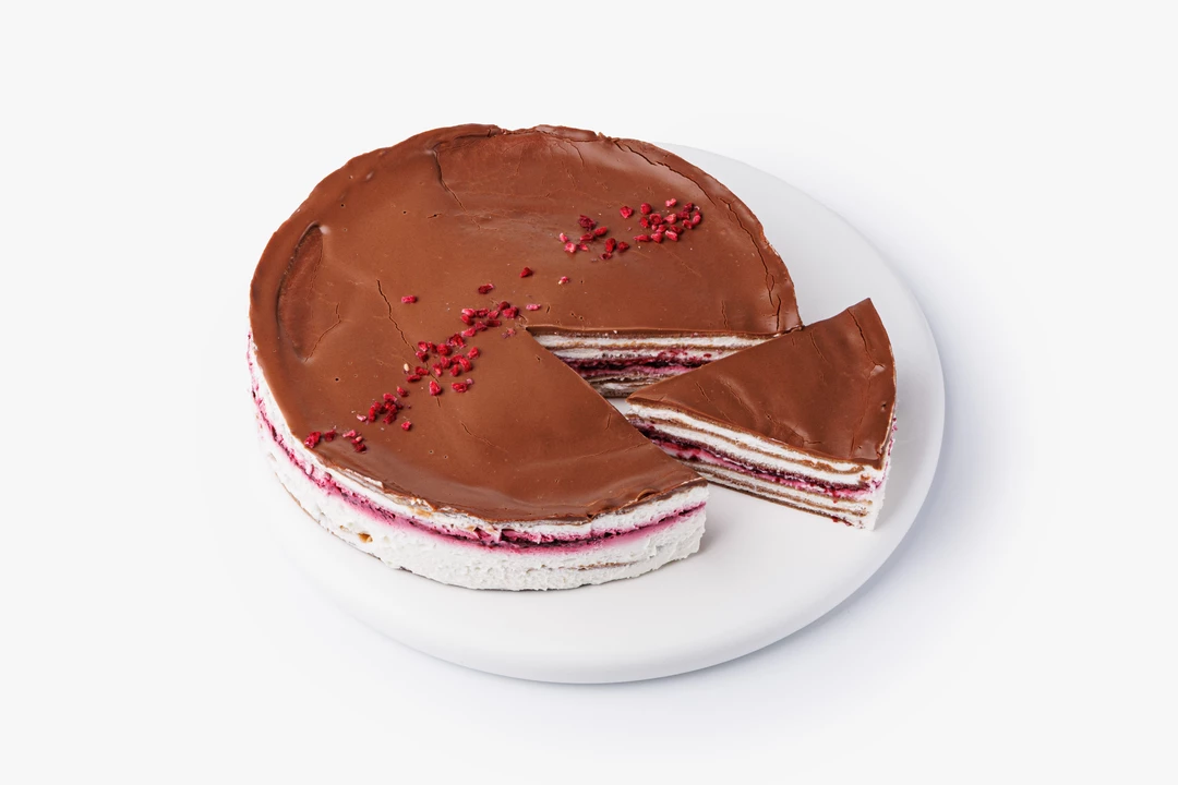 Торт из тонких шоколадных блинчиков с ягодной прослойкой и сливочно-сырным кремом. В составе малина и жимолость. Покрыт тёмным шоколадом.