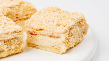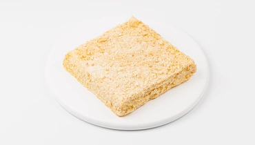 Рецептура домашнего «Наполеона» передавалась из поколения в поколение. Коржи приготовлены из рубленого теста и обильно смазаны свежим заварным кремом с добавлением сгущённого молока. Для уютного чаепития в кругу самых близких — то, что нужно!
