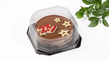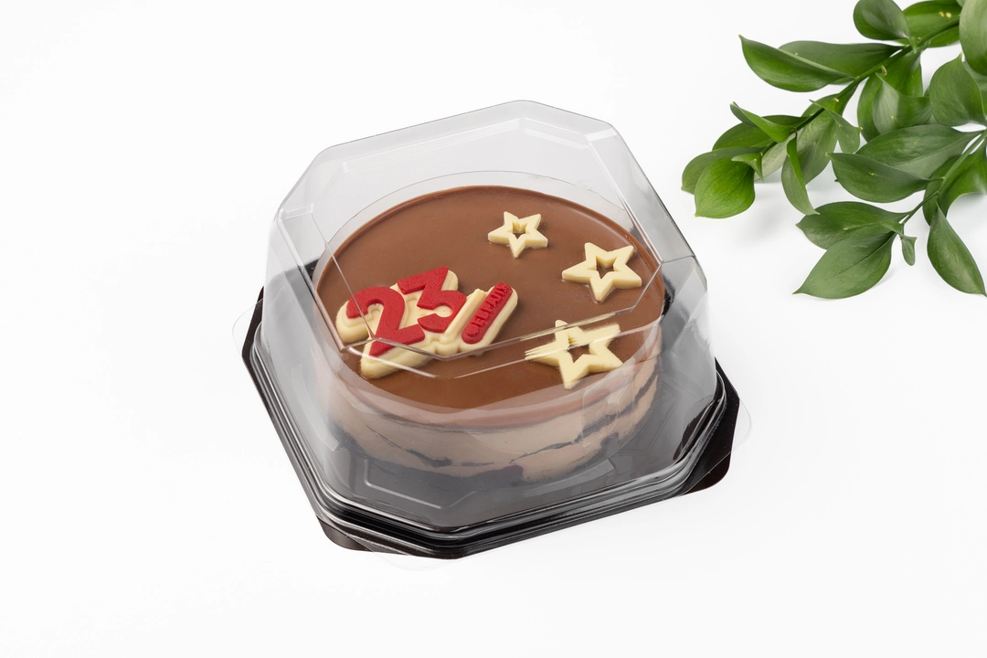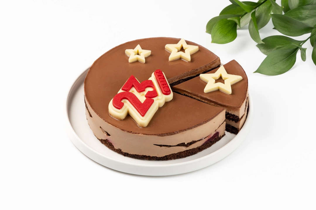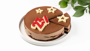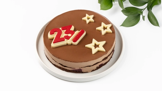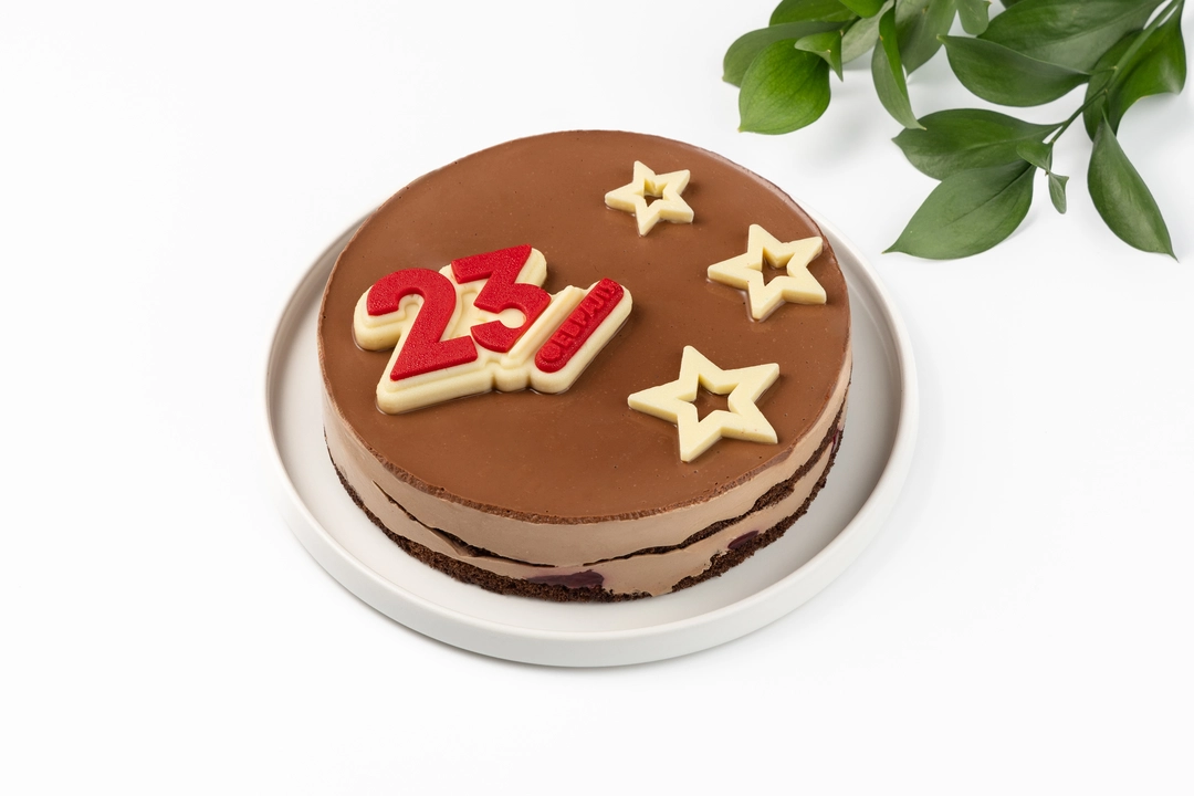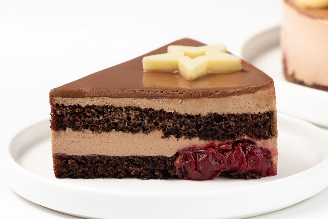 Торт из шоколадных бисквитных коржей с прослойками из воздушного мусса и начинкой из ягод вишни. Сверху десерт украшен праздничным шоколадным декором.