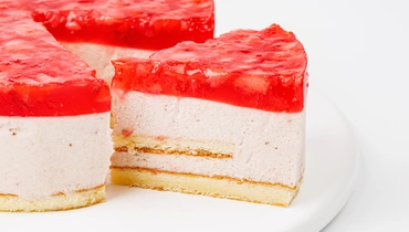 В основе этого торта — два пышных японских бисквита с воздушной «губчатой» текстурой, которая словно тает на языке. Нежность бисквитной основы органично дополняет бананово-сливочный мусс, привнося во вкус деликатную сладость фруктовых нот. Торт завершает клубничное желе, объединяющее оба слоя ненавязчивым звучанием ягодной кислинки. Такое лакомство замечательно подойдёт как для повседневного чаепития, так и для торжественных историй.