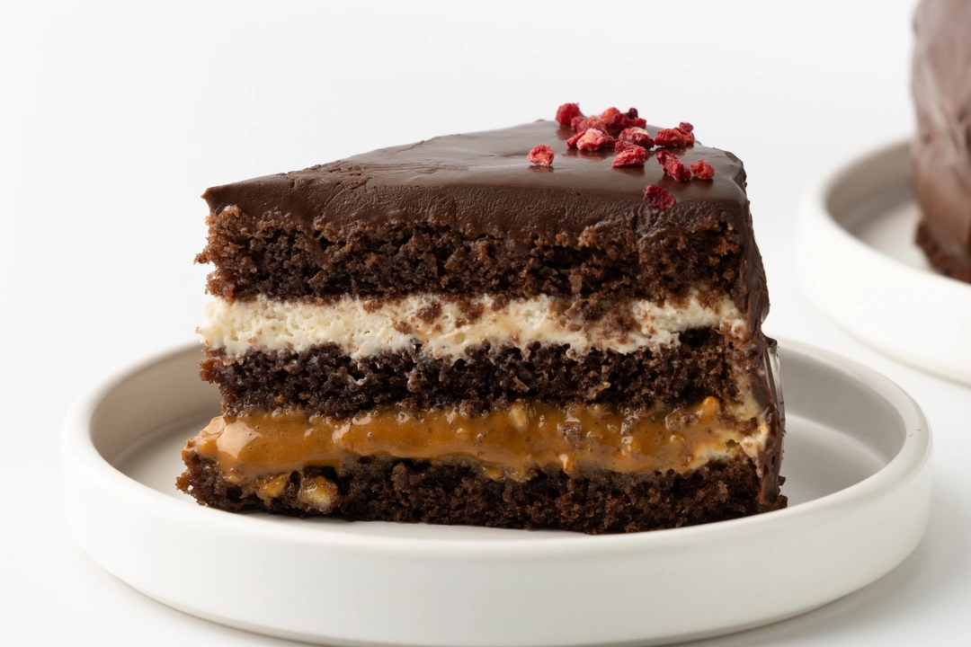 Торт с выразительным орехово-шоколадным вкусом. В его основе пышный шоколадный бисквит со сливочно-ореховым кремом и начинкой из варёной сгущёнки с дроблёными ядрами арахиса. Сверху десерт покрыт шоколадом и украшен праздничной шоколадной надписью и сублимированной малиной.