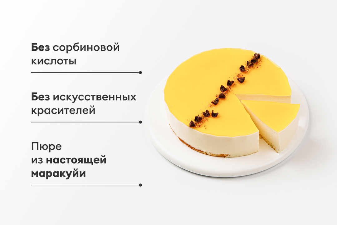 Приготовили большой торт из нежнейшего творожно-сливочного суфле и пюре из маракуйи. Состав проверен: нет сорбиновой кислоты и искусственных красителей
