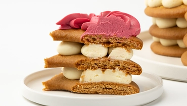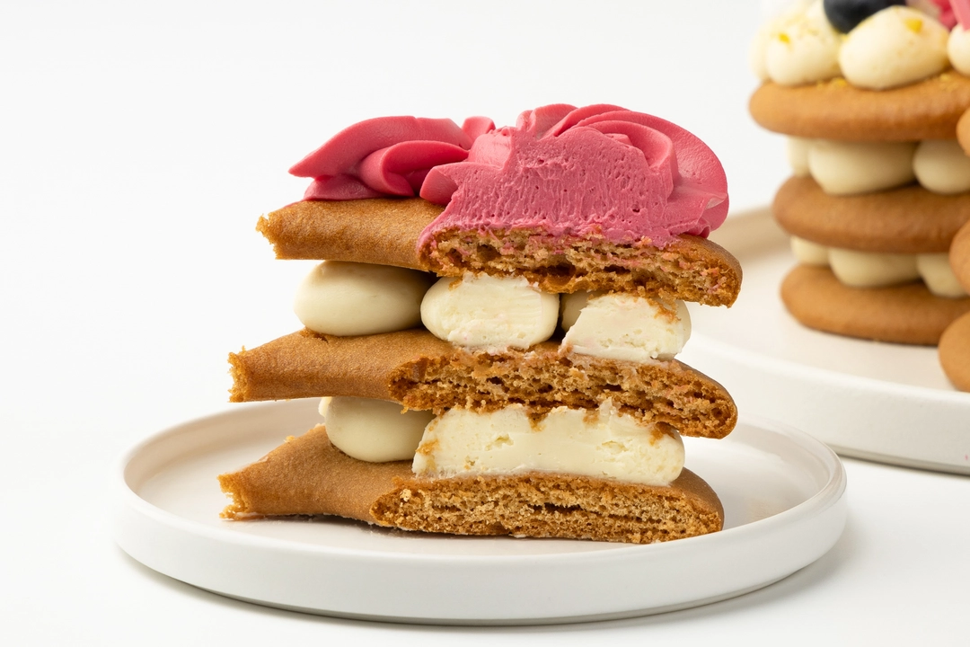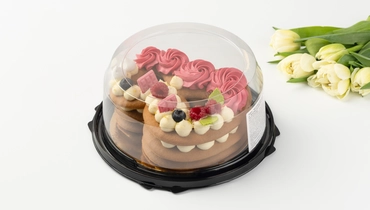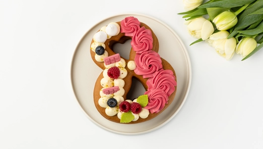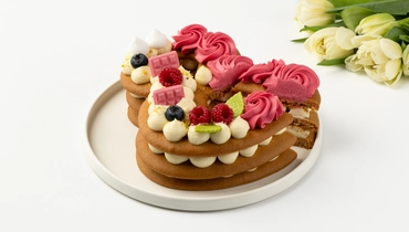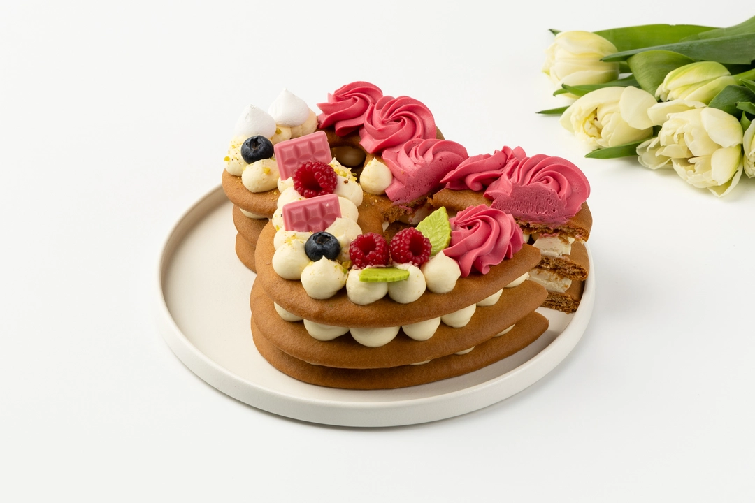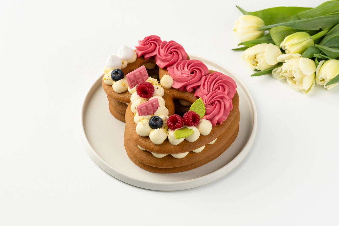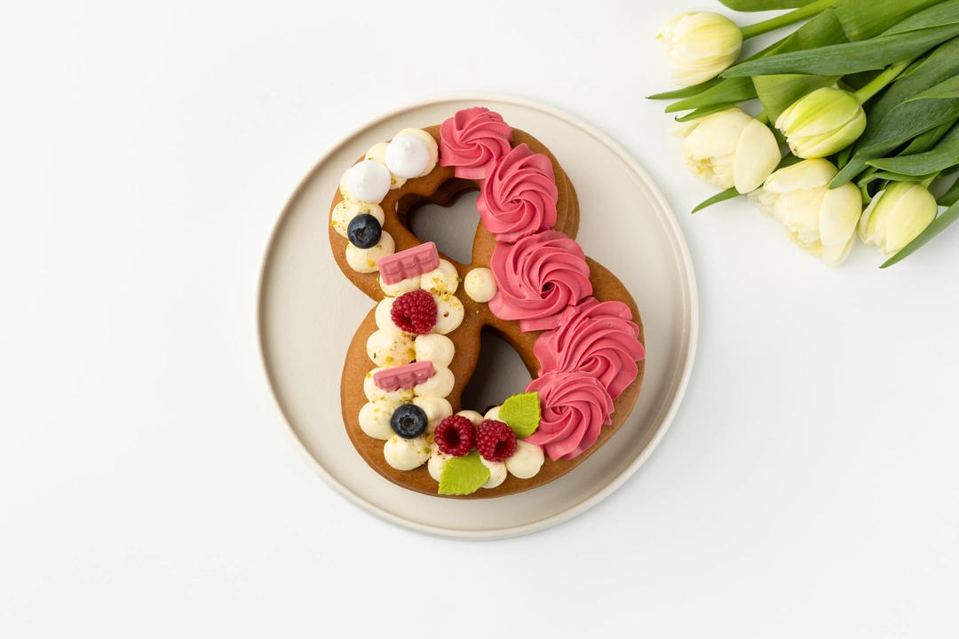 Торт в форме восьмёрки из медовых коржей с прослойками сырно-сливочного крема. Украшен шоколадным декором, фисташковой крошкой, ягодами голубики, малиновым мармеладом и меренгой