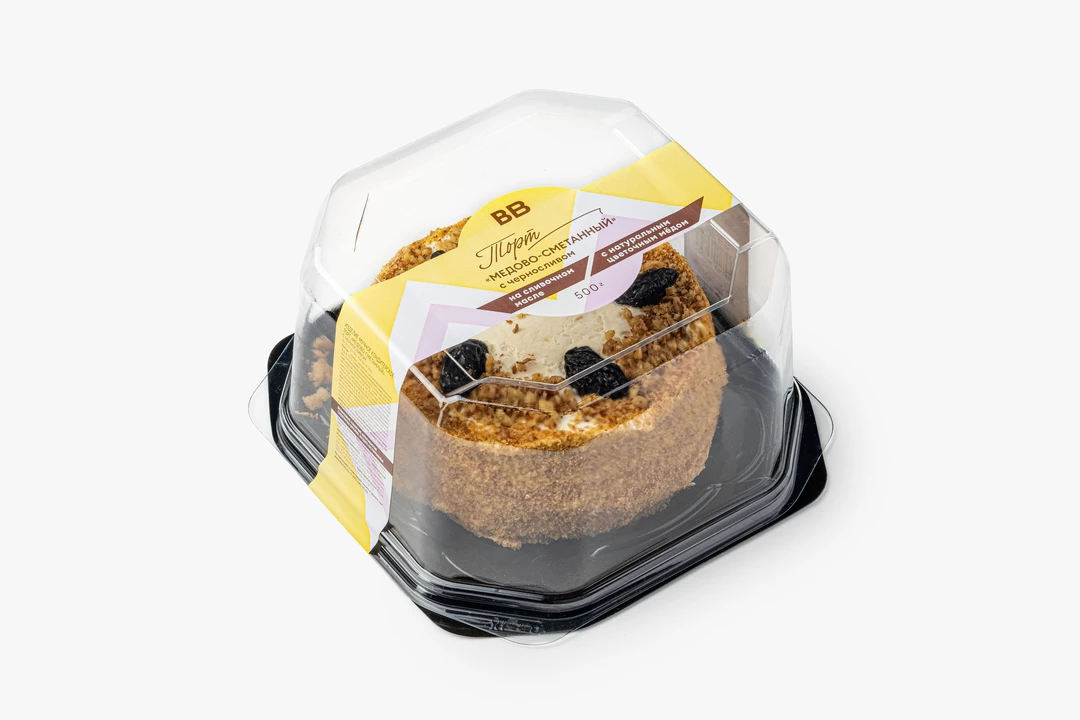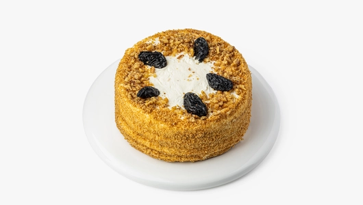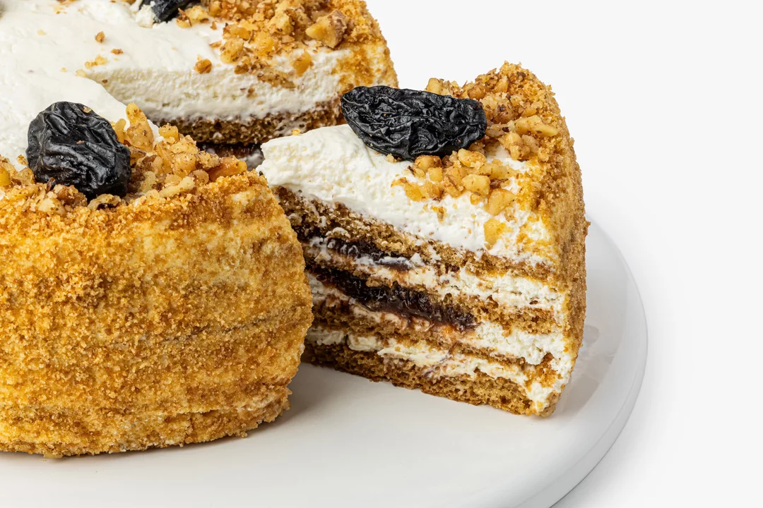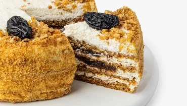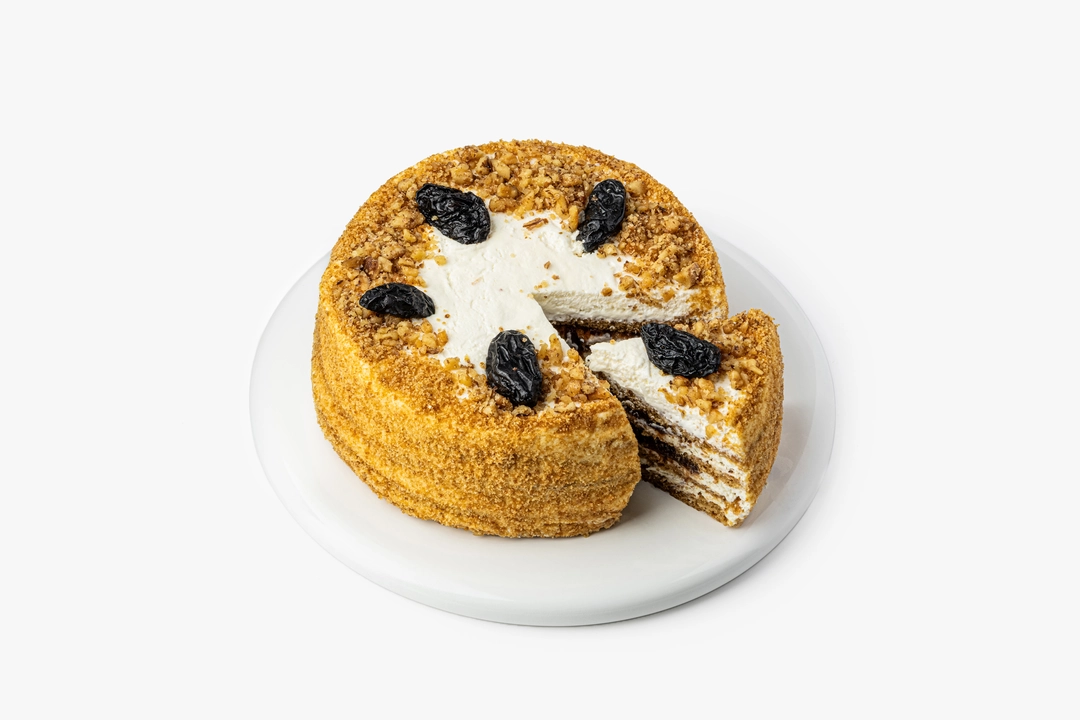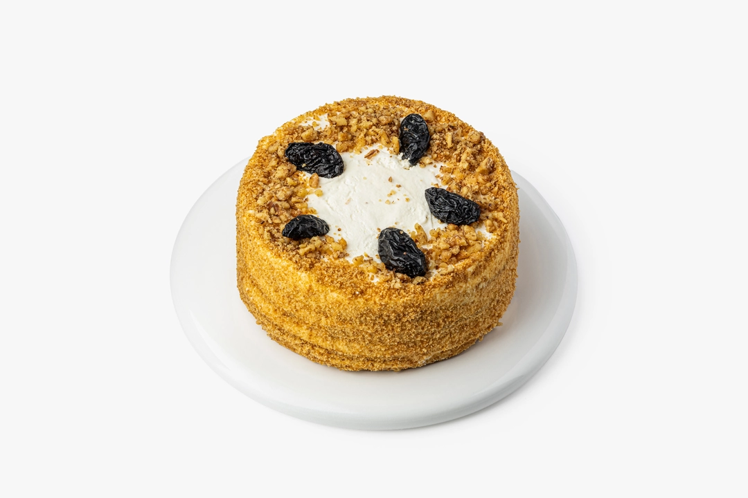 Медово-сметанный торт с мягкими коржами и кремом на основе сметаны и сливок. Покрыт золотистой бисквитной крошкой и декорирован черносливом с дроблёными ядрами грецкого ореха.