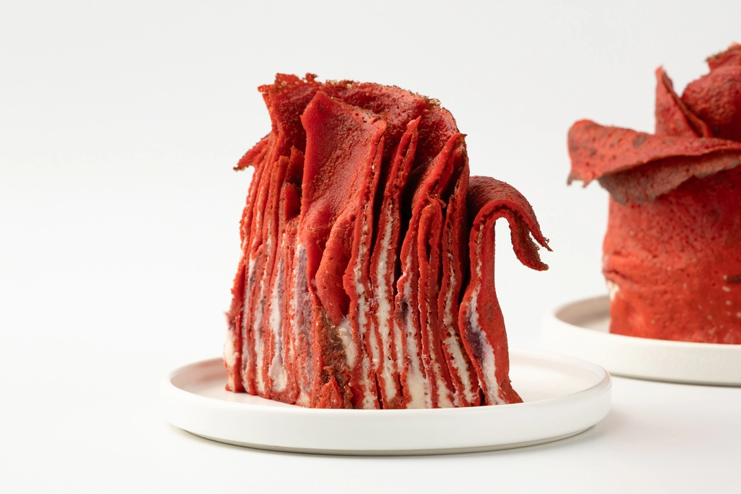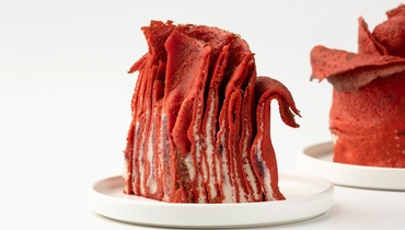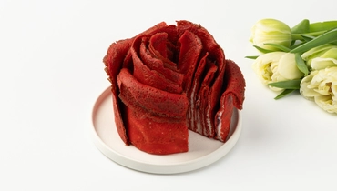 Оригинальный торт в форме розы из ажурных блинчиков, пропитанных сырно-творожным кремом с добавлением сгущённого молока и малиново-клубничного конфитюра