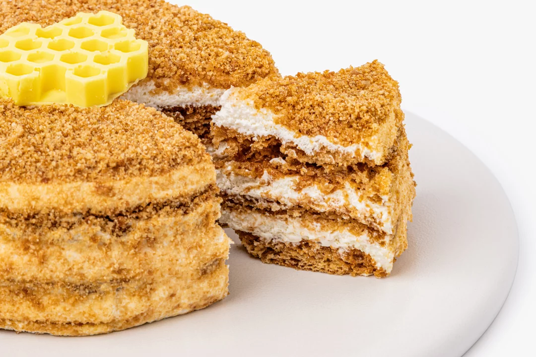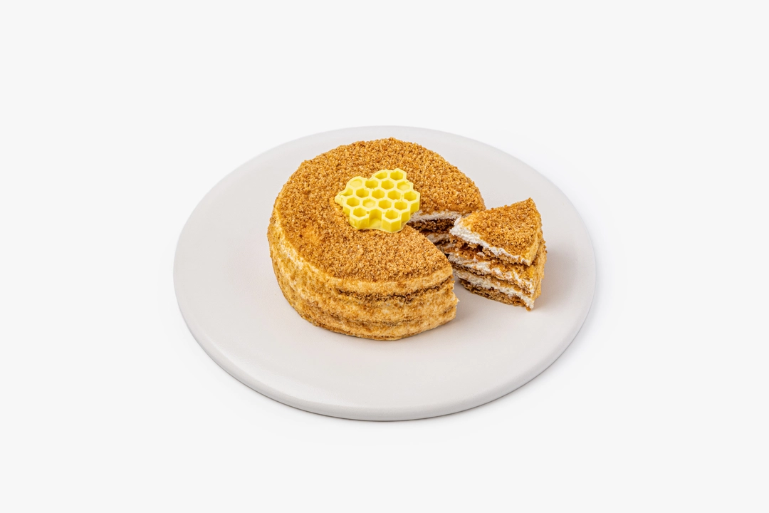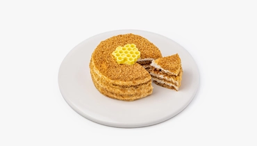Небольшой медовый торт на основе рисовой, льняной и амарантовой муки. Коржи на цветочном мёде прослоены сметанно-сливочным кремом. Декорирован белой шоколадной глазурью.