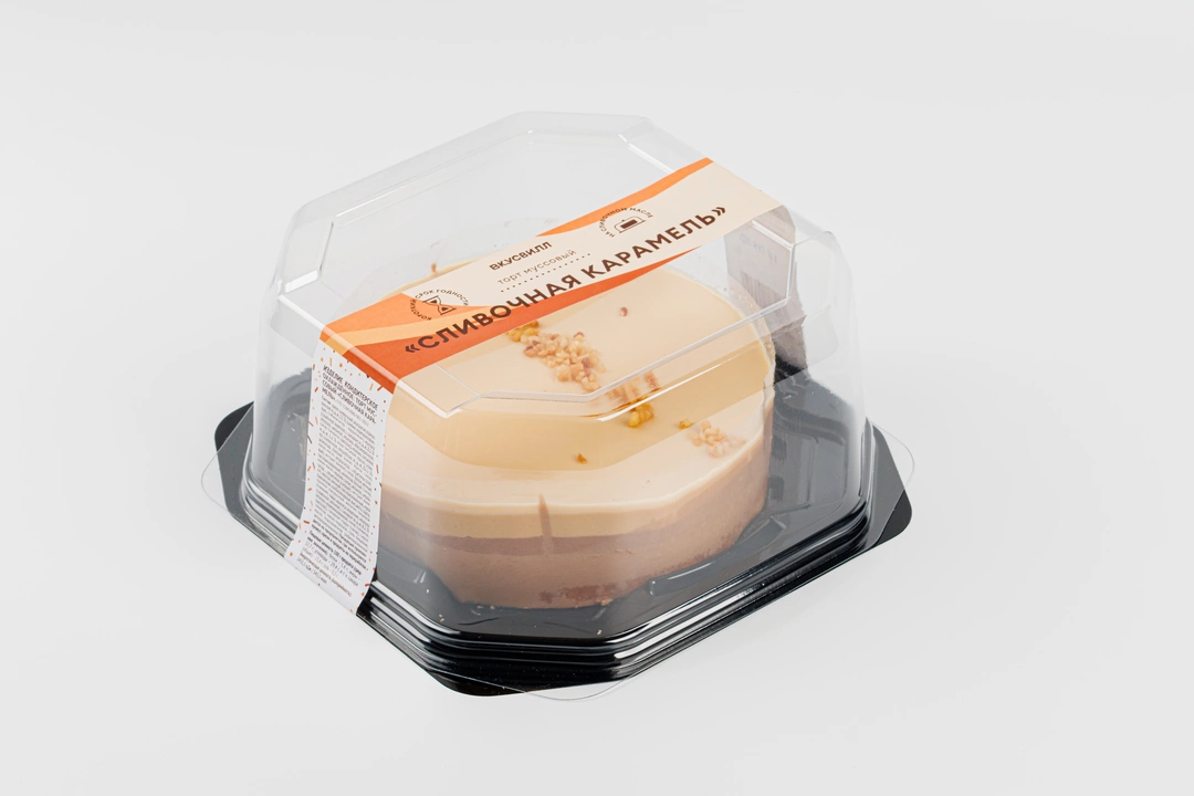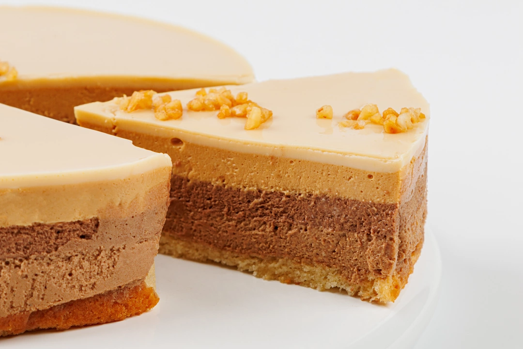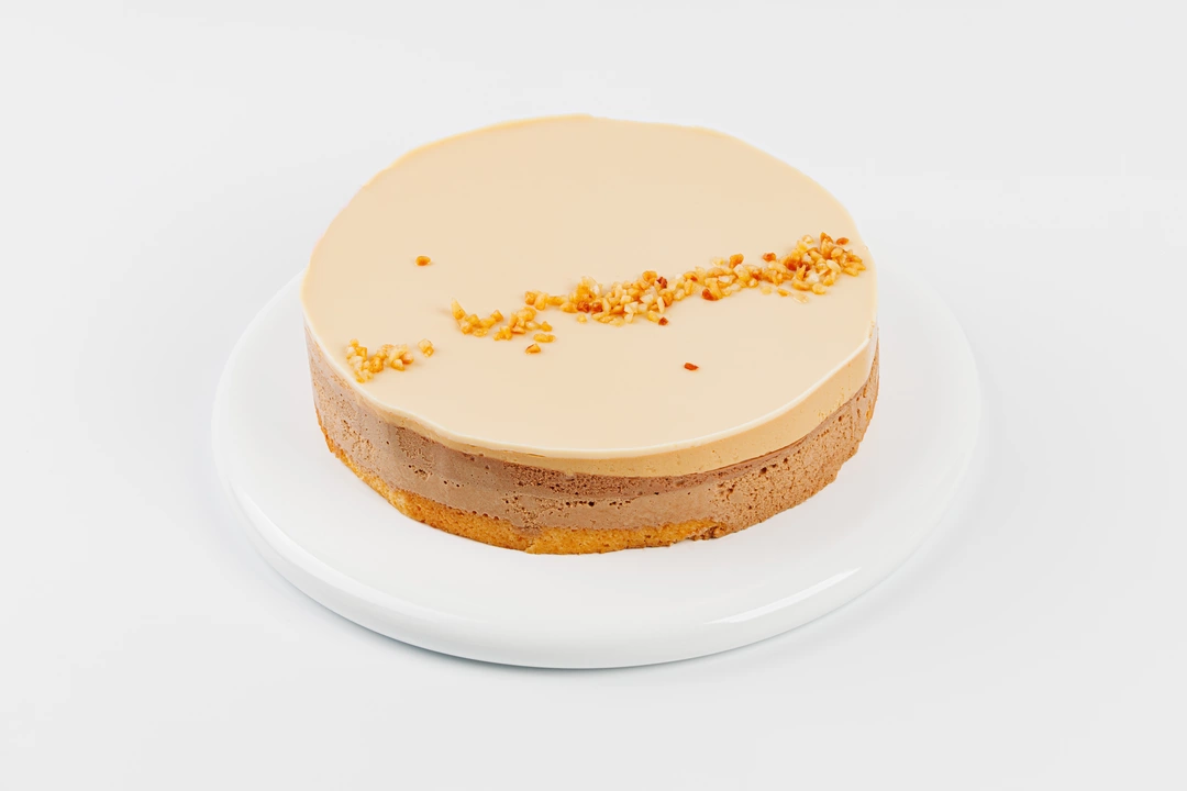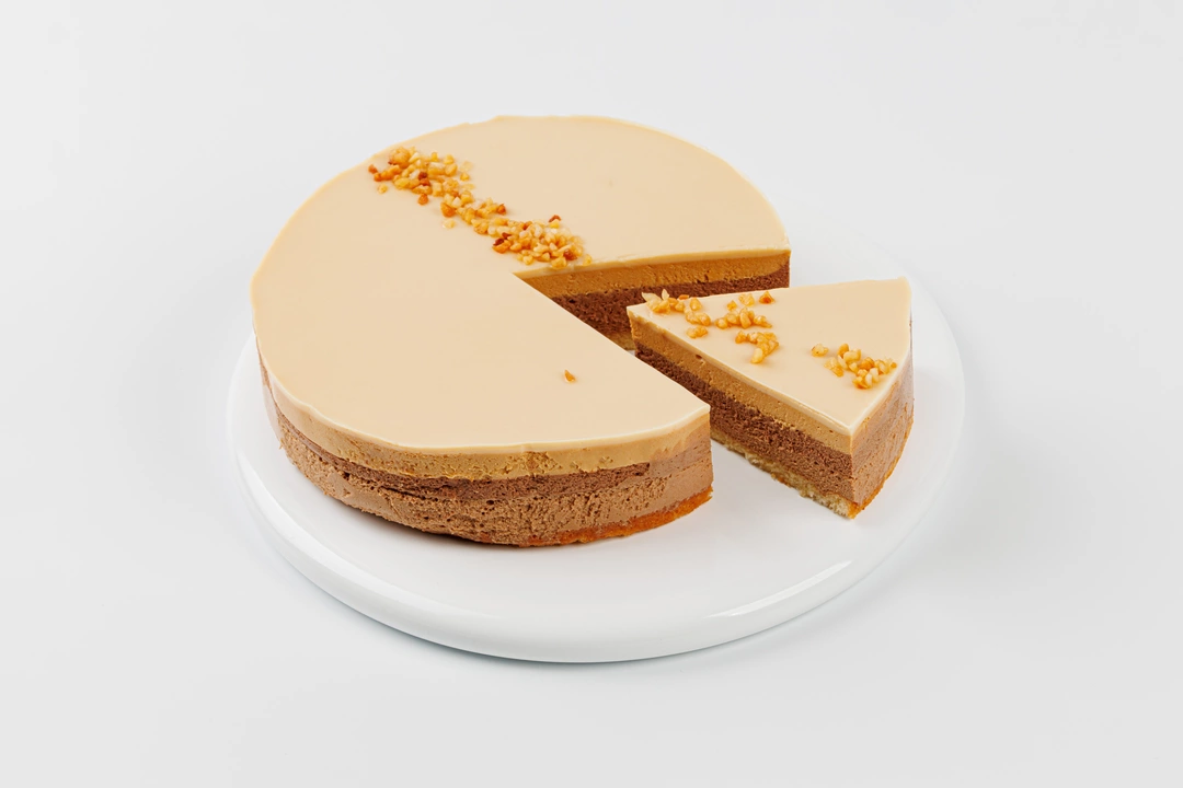 Воздушный торт с карамельным вкусом, в котором сочетаются два слоя мусса — с молочным и тёмным шоколадом. Лёгкий бисквит служит основой, а верхний слой покрыт сливочной карамелью и украшен дроблёным арахисом.