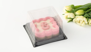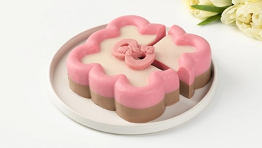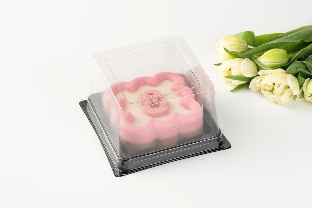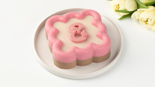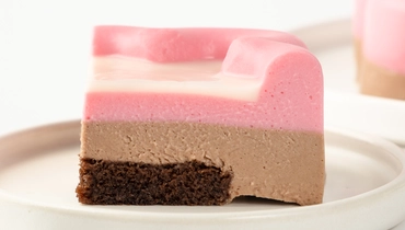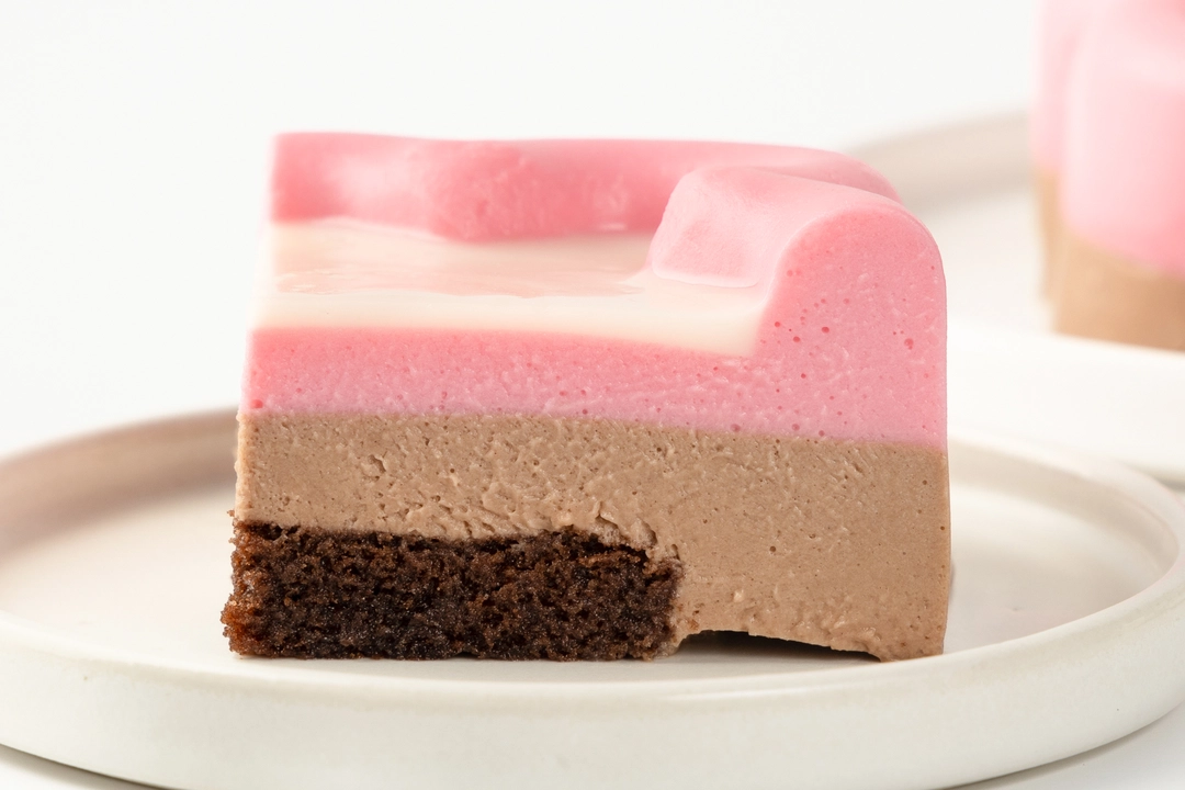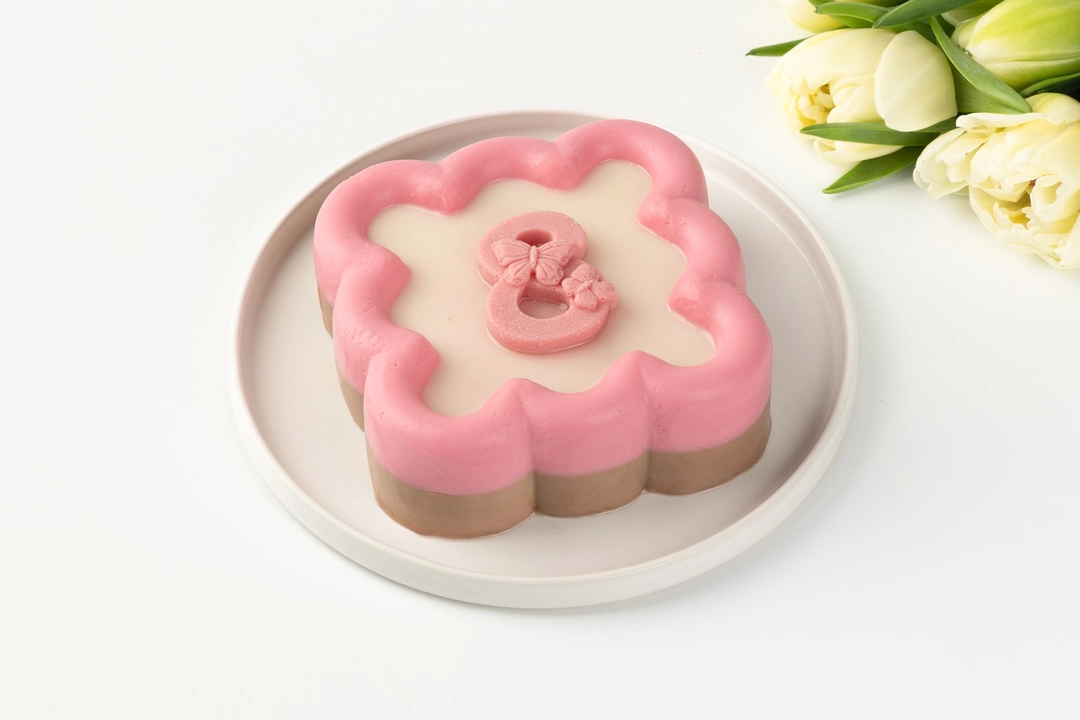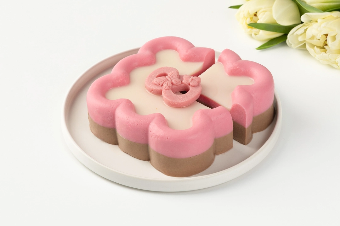 Небольшой бисквитно-муссовый торт с шоколадным вкусом. Десерт украшен праздничным декором из белого шоколада