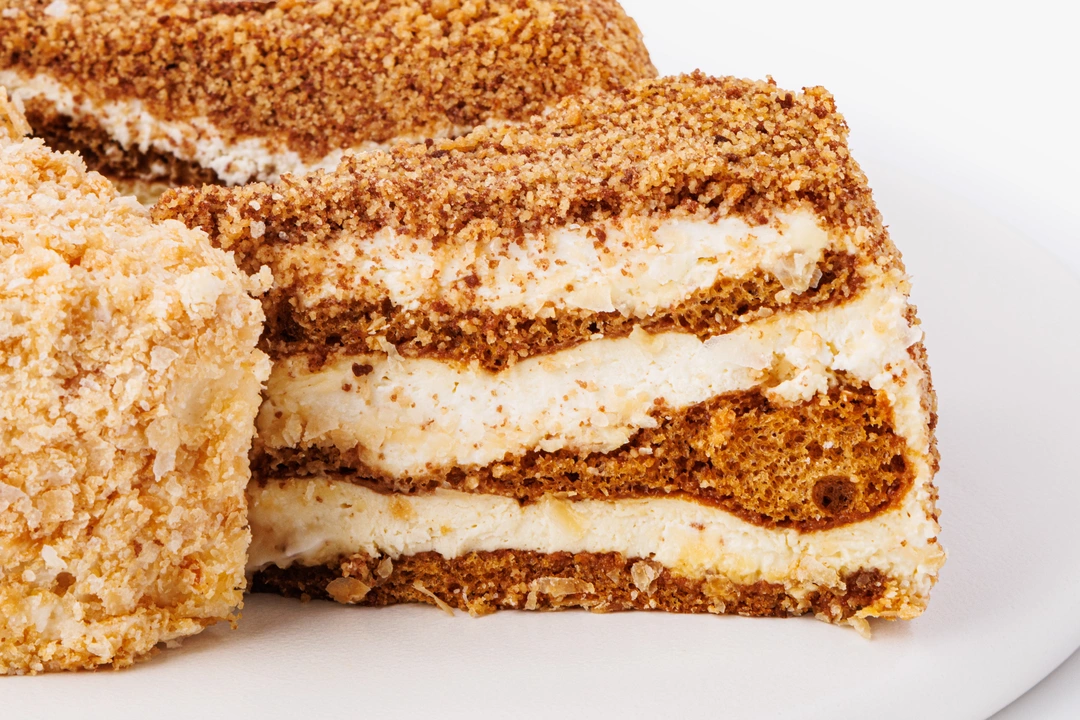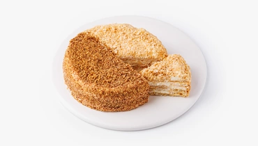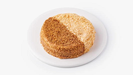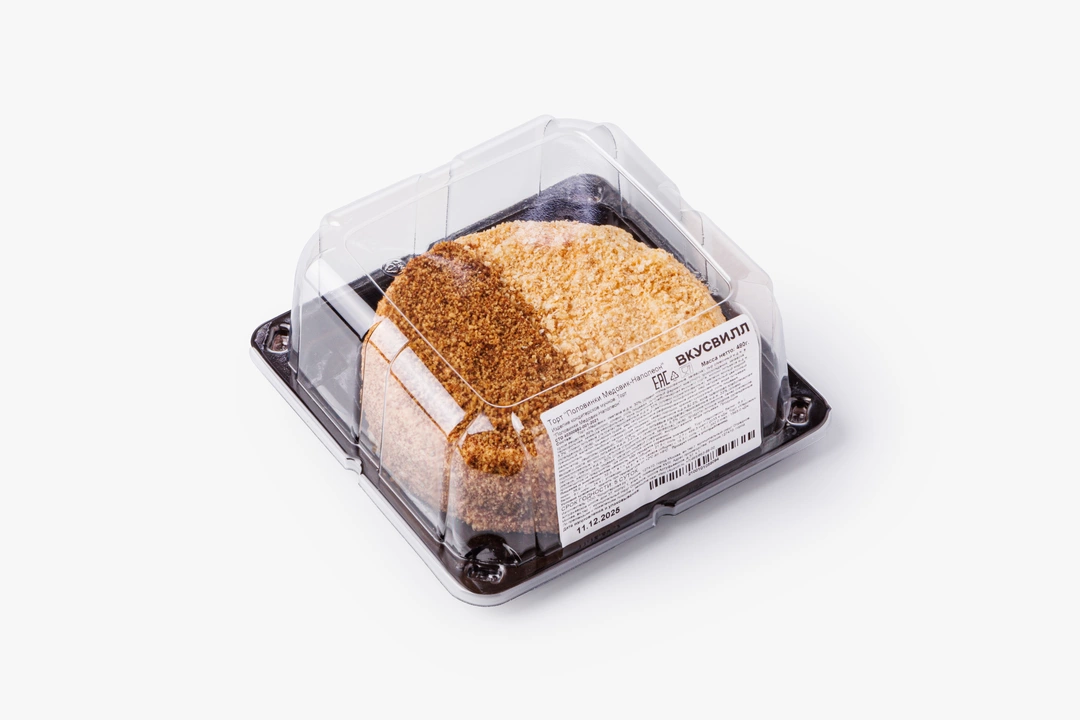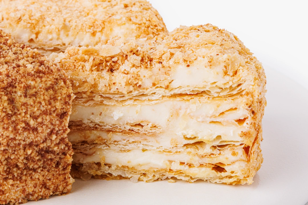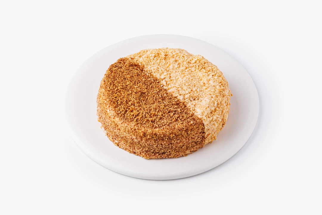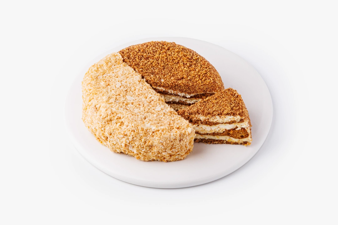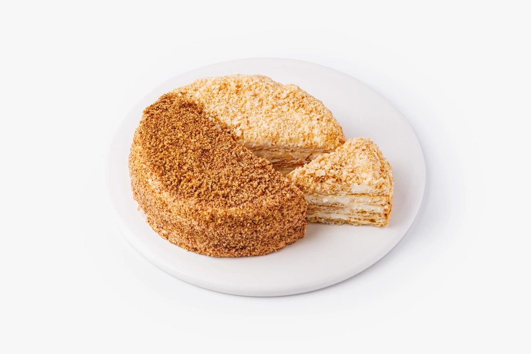 Два классических десертных вкуса — медовик и наполеон — в одном торте. Одна его половина состоит из медовых коржей со сметанно-сливочным кремом, другая — из слоёного теста с заварным кремом на сгущённом молоке.