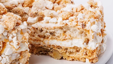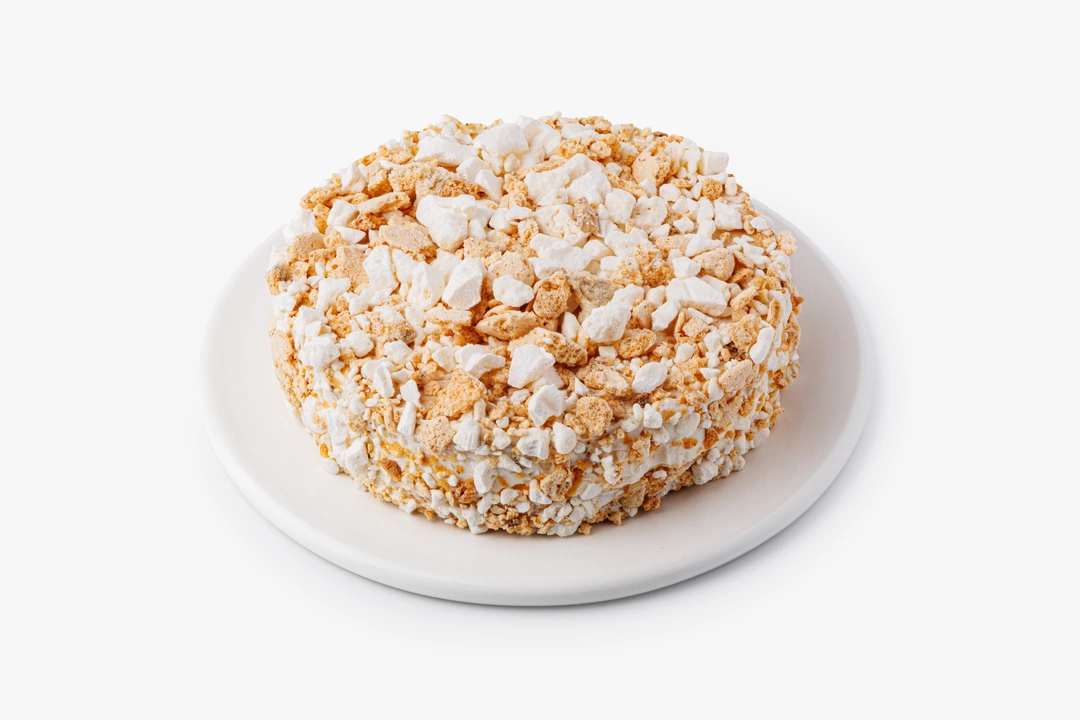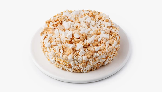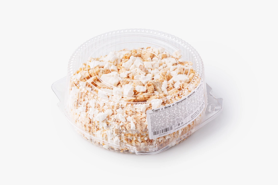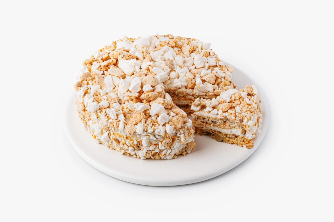 Лёгкий и сбалансированный по сладости торт с воздушными коржами безе и сливочным кремом. Отличается большим количеством дроблёных грецких орехов. Подходит для семейного чаепития и придётся по вкусу как взрослым, так и детям. Десерт бережно заморожен и может храниться в морозильной камере долгое время.
