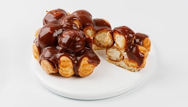 Нежные профитроли с классическим ванильным кремом «Дипломат» собраны в основе торта и покрыты слоем шоколада. Дополняет композицию воздушный сливочный крем с мягким вкусом и лёгкой сладостью.