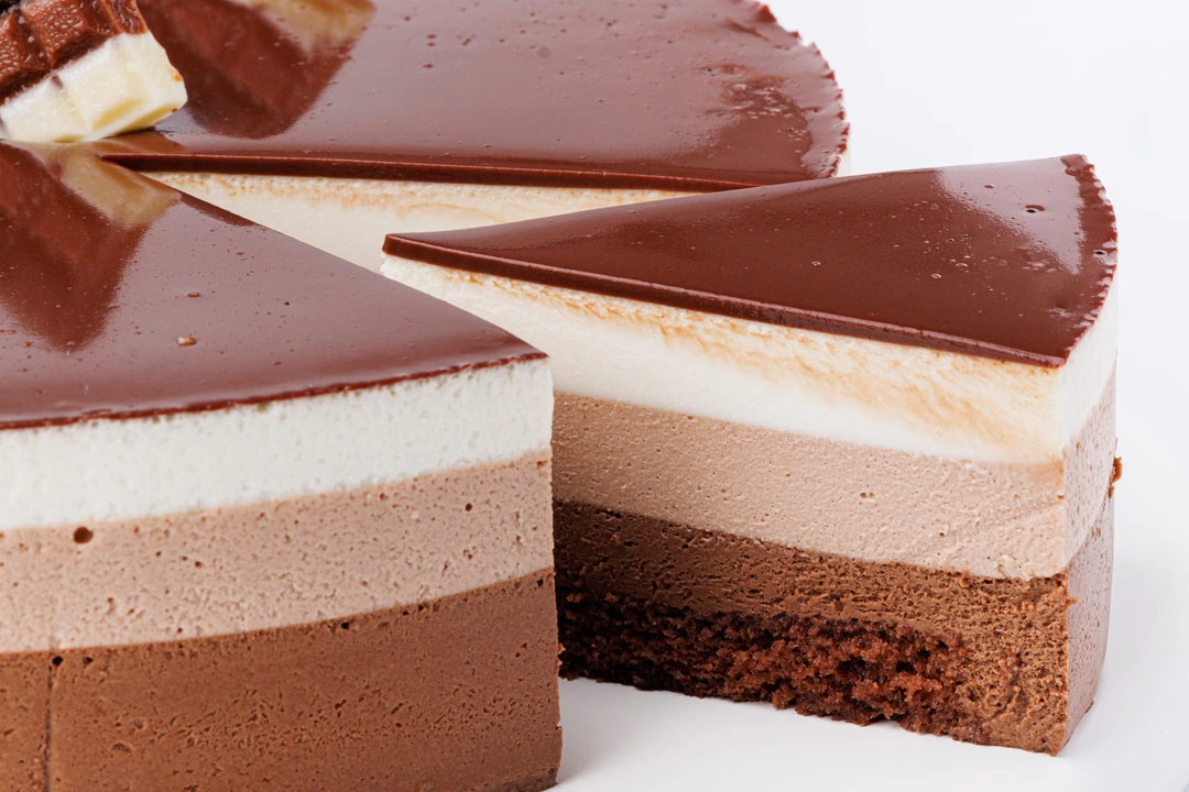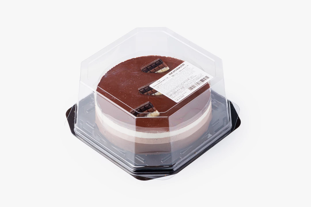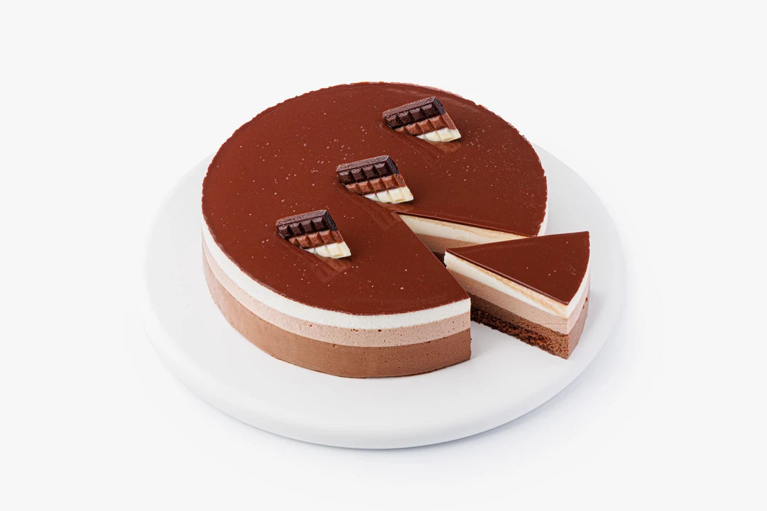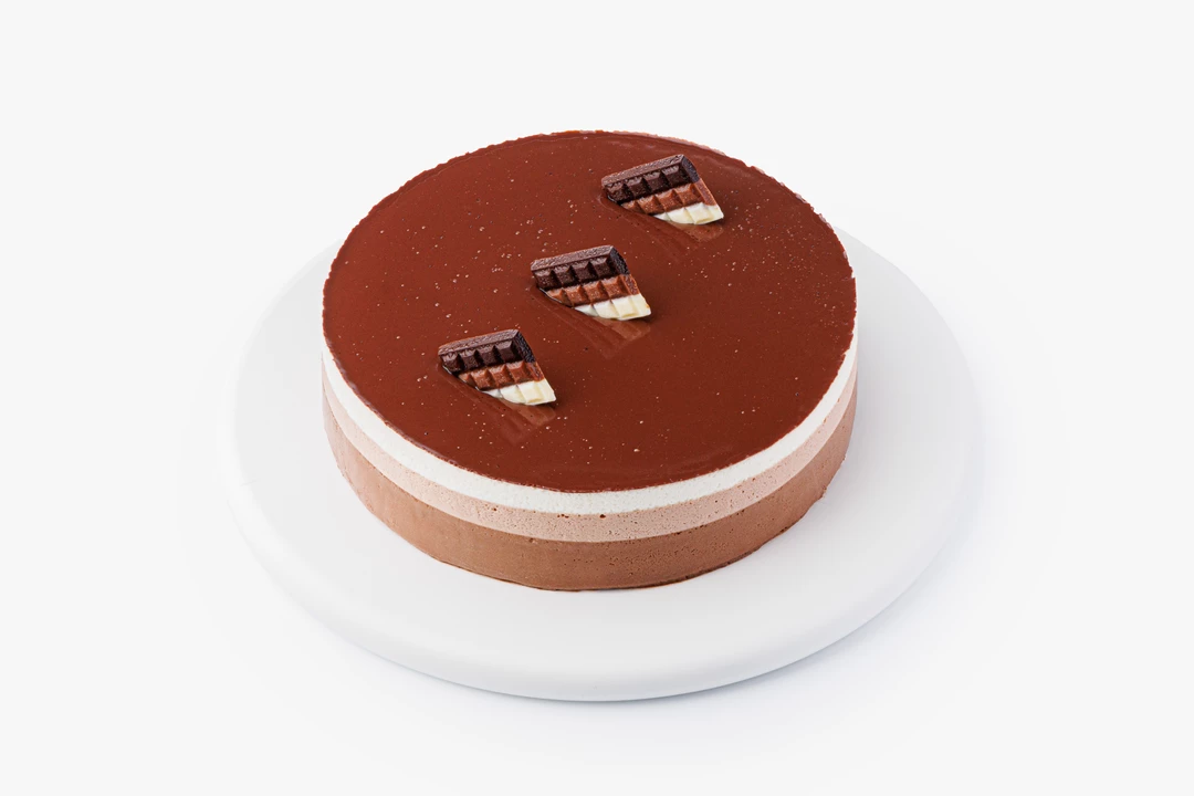 Один из бессменных фаворитов, испечённый в увеличенном формате: чтобы за праздничным столом его точно хватило на всех. Торт состоит из тонкого бисквитного коржа и трёх муссовых шоколадных слоёв. Горчинка тёмного шоколада гармонично дополняется нежностью молочного, а белый шоколад завершает вкусовую композицию лёгкими ванильными нотами.