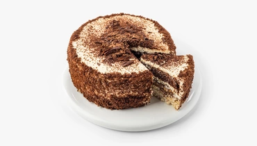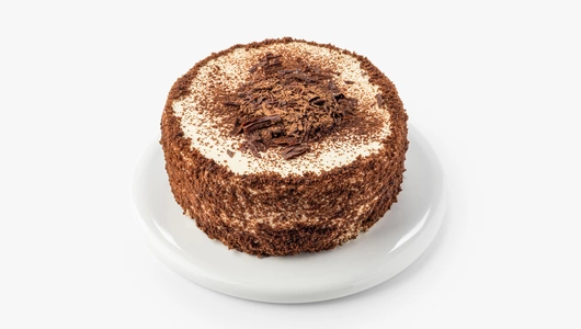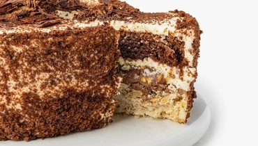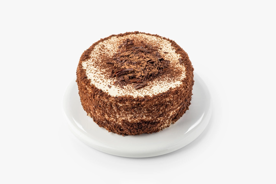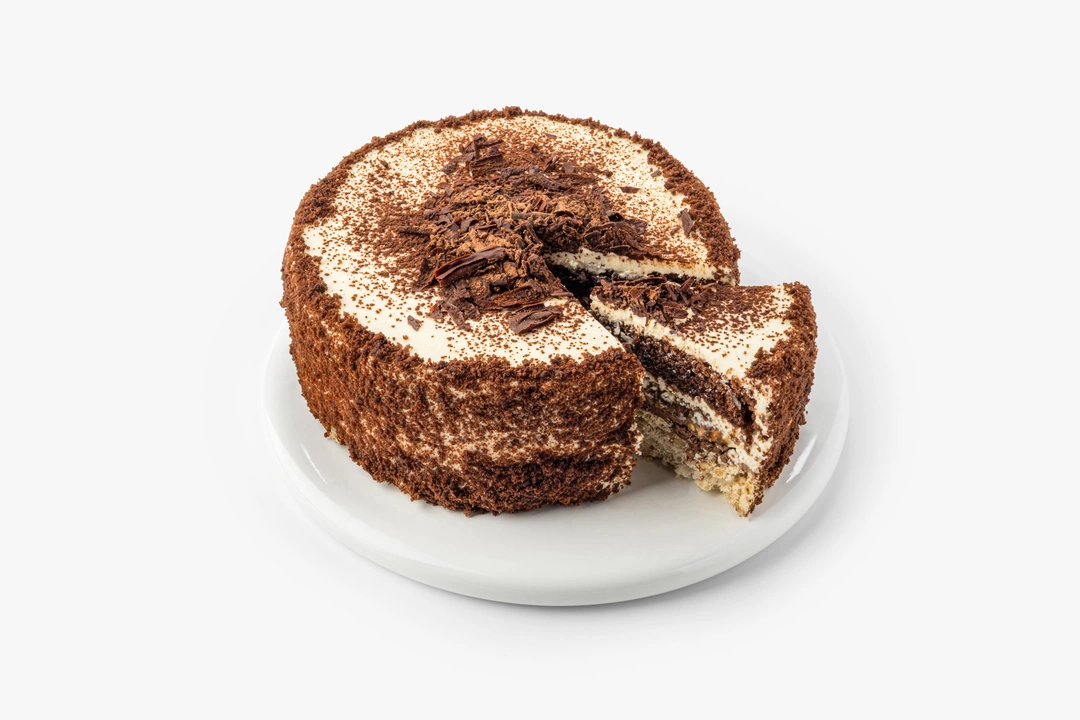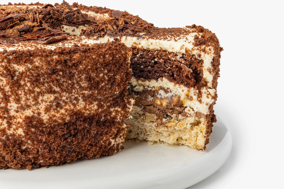 В основе торта слой воздушного безе с творожным кремом и дроблёными ядрами арахиса и грецкого ореха. Сверху десерт украшен шоколадной стружкой и крошкой. У него контрастная текстура и глубокий вкус.