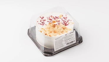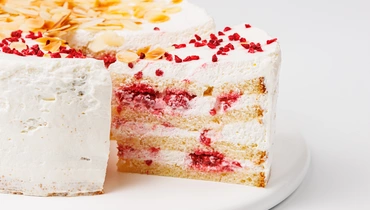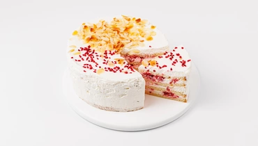 Классический сметанный торт с акцентом на натуральную малину. В основе — пышные коржи на сгущёнке, пропитанные кремом из сметаны и ягод. Вкус мягкий, чуть кисловатый, с нотками яркой малиновой свежести. Сверху — кремовый слой, украшенный сублимированной малиной и лепестками миндаля, которые добавляют текстурный контраст. Подходит для неспешного чаепития и в качестве лёгкого десерта к праздничному столу.