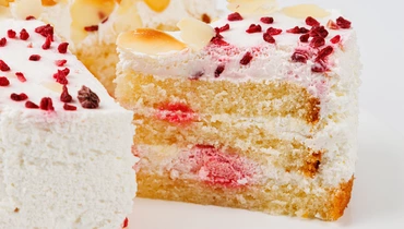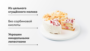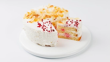 В этом десерте сочетаются мягкий бисквит, приготовленный без дрожжей, и нежный сметанный крем с ароматной малиной. Элегантно декорированный миндальными лепестками и сублимированными ягодами, он станет украшением стола.