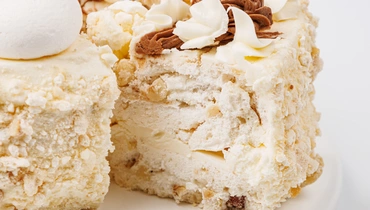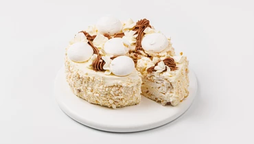 Воздушное безе, масляный крем и щедрая порция арахиса — классика, которая не теряет своей популярности. Крем на основе сливочного масла хорошо сочетается с белковой основой, делая структуру торта более цельной, но не тяжёлой. А оформление с шоколадными акцентами и маленькими безе на поверхности добавляет десерту нарядности. Ностальгический вкус в современном исполнении с приятной сладостью и ореховым ароматом.