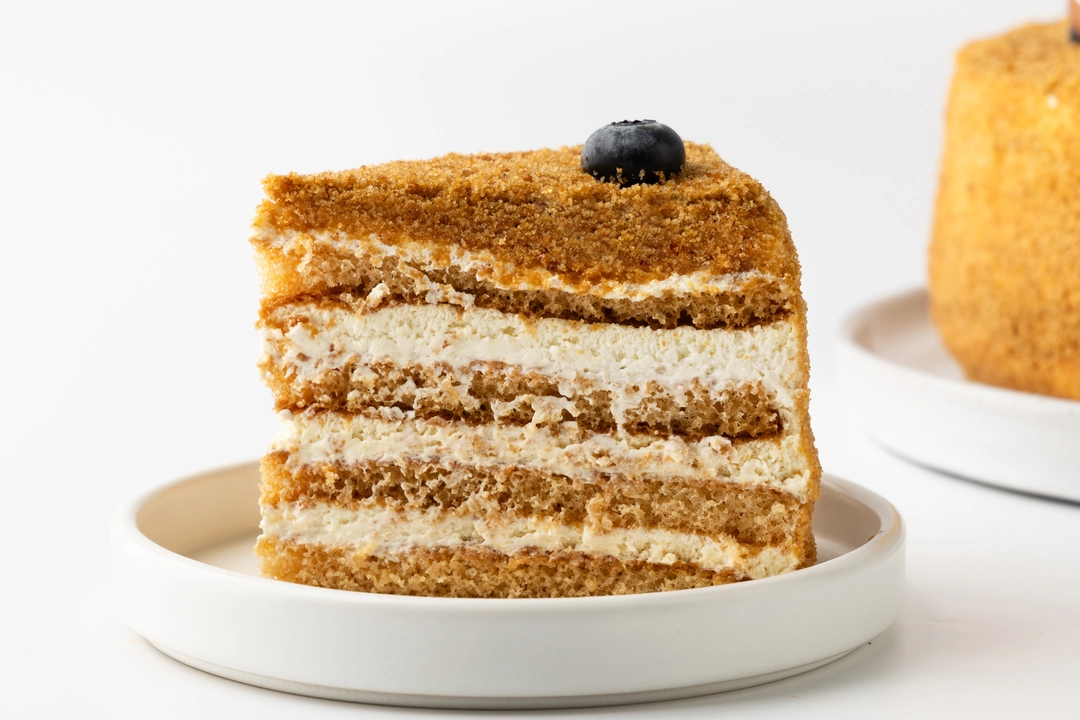 Классический торт из ароматных коржей на натуральном меду, пропитанных сметанным кремом. Сверху десерт украшен декором из имбирного пряника с натуральными красителями и цельными ягодами голубики.