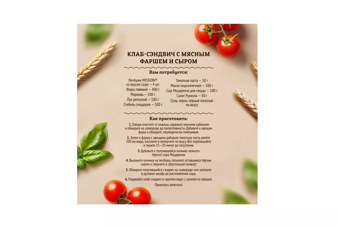 Встречайте новинку – Лепешки MISSION со вкусом СЫРА! Насыщенный сырный аромат лепешки, произведенной исключительно из пшеничной муки высшего сорта, поможет в приготовлении быстрого и необычный рецепта на радость близким и друзьям! Сырные лепешки идеально подходят для создания сэндвичей и роллов на любой вкус! Лепёшки станут эластичнее, если перед приготовлением сбрызнуть их водой и разогреть в микроволновой печи, на гриле или на сковороде. MISSION. ВКУСНО, УДОБНО, БЕСПОДОБНО! Страна производитель-Россия