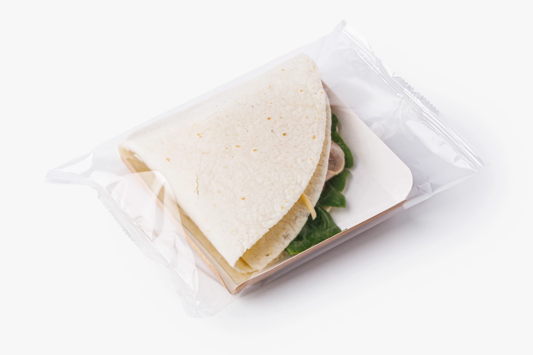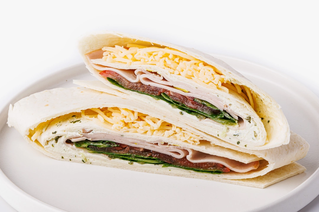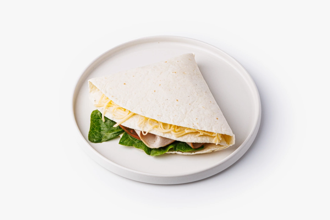 Пшеничная тортилья с нежной мортаделлой, сыром и ароматным соусом песто. Здесь лепёшка сочетается с начинкой из итальянской колбасы с фисташками, тёртого твёрдого сыра и творожного сыра. Свежий томат и шпинат добавляют сочность, а песто на основе базилика, кешью и оливкового масла с сырами объединяет вкусы. Сытное и ароматное блюдо для перекуса или быстрого обеда.