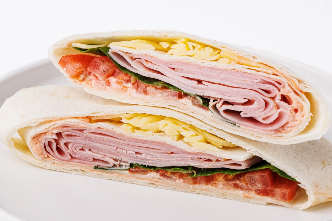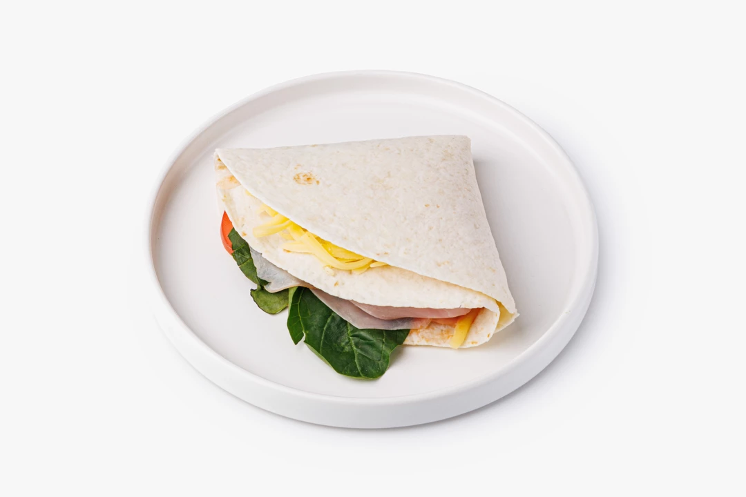 Тонкая пшеничная тортилья с начинкой из ветчины, сыра и свежих овощей. Плотные ломтики ветчины и тёртый сыр создают классическое сочетание, в котором сливочная мягкость сыра оттеняет солоноватый вкус мяса. Томатный соус с лёгкой пряной нотой и каплей майонеза добавляет сочности, а шпинат придаёт свежесть и яркость. Всё это завернуто в мягкую лепёшку. Тортилья удобна для перекуса на ходу или быстрого обеда.