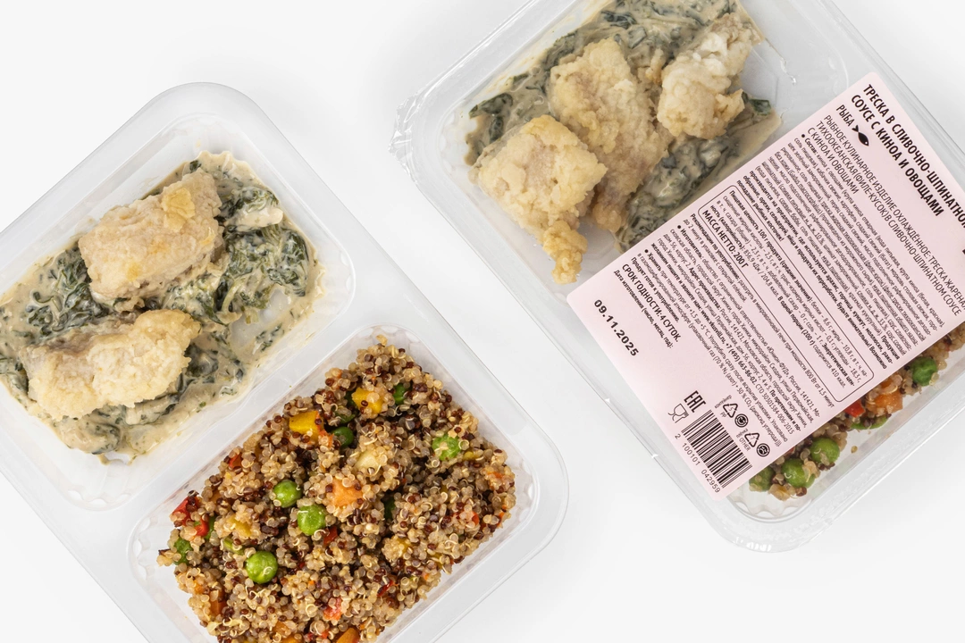 Нежное филе трески в сливочно-шпинатном соусе сочетается с мягкой киноа и запечёнными овощами. Вкус получается сбалансированным: сливки смягчают шпинат, сладость батата и моркови перекликается с лёгкой пикантностью соевого соуса, а треска остаётся сочной и деликатной. Зернистая текстура киноа делает блюдо сытным, но лёгким. После разогрева сливочный соус вновь становится бархатным, рыба пропитывается ароматом овощей, а всё вместе складывается в гармоничное, тёплое блюдо с нежным сливочным вкусом.