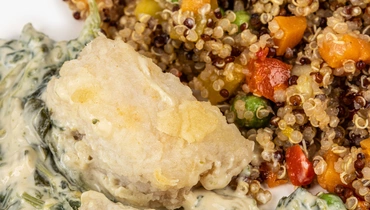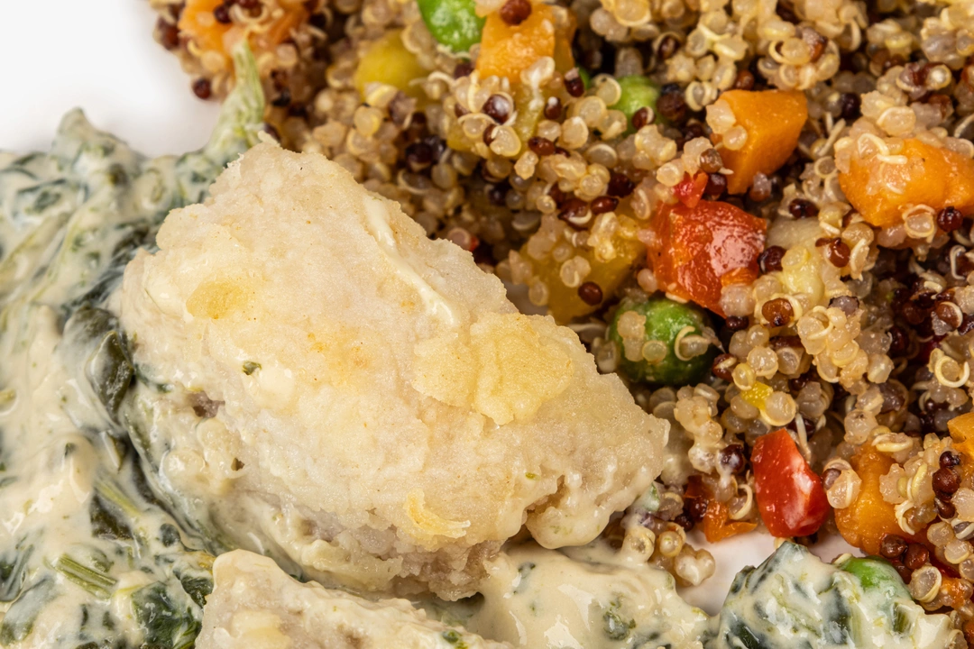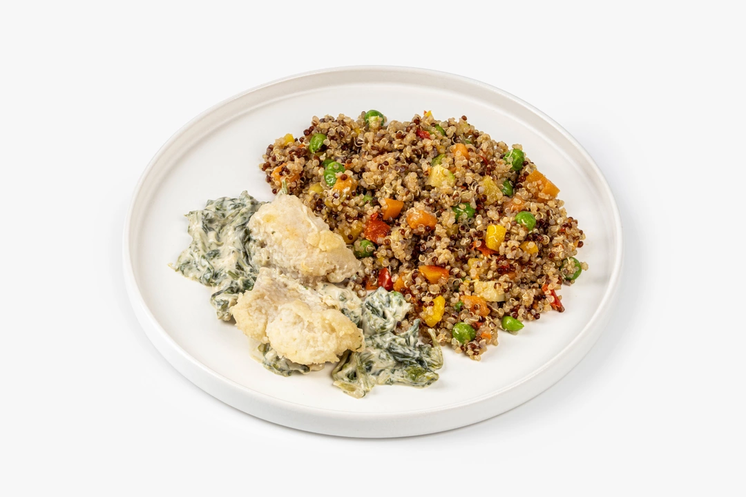 Треска в сливочно-шпинатном соусе с киноа и овощами