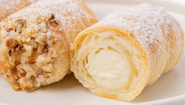 Слоёные трубочки с начинкой из творожного сыра и сливок. Хрустящее тесто приготовлено на сливочном масле. Начинка дополнена дроблёными ядрами фундука.