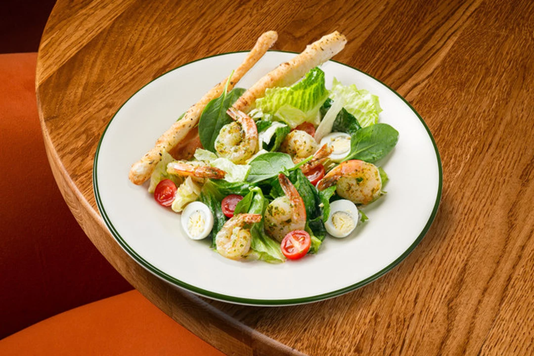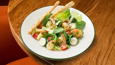 Бескомпромиссный хит: листья салата, креветки ,перепелиные яйца, помидоры черри, гренки и фирменный соус «цезарь».