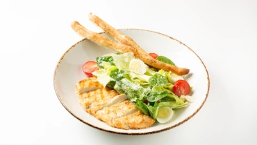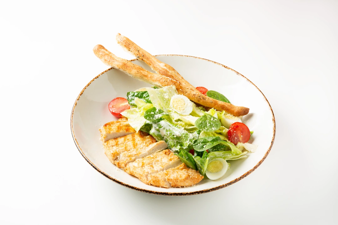 Бескомпромиссный хит: листья салата, кусочки обжаренной на гриле курицы,перепелиные яйца, помидоры черри, гренки и фирменный соус «цезарь».