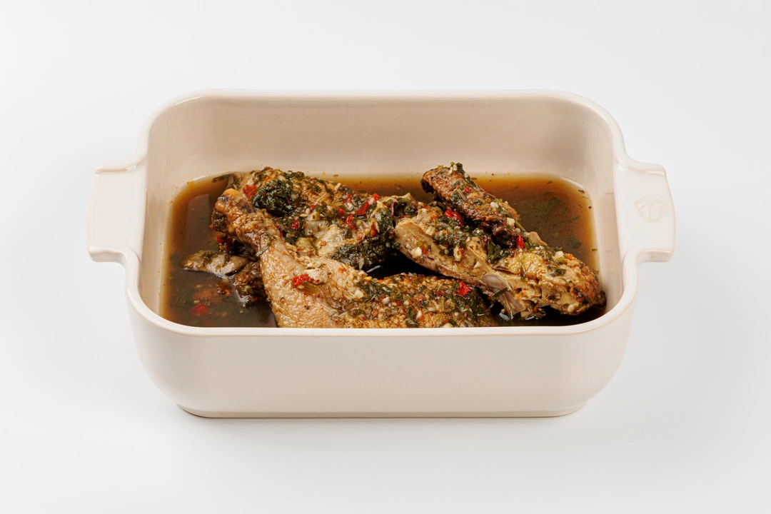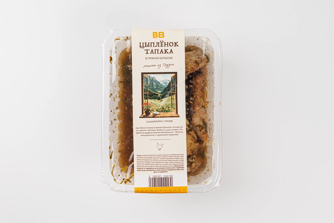 Запечённый цыплёнок в ароматном бульоне приготовлен по традиционному грузинскому рецепту. Пряности добавляют мягкому куриному мясу тёплый акцент, а наваристый бульон с чесноком и овощами делает его ещё более душистым. Подогрейте открытый контейнер в микроволновой печи, переложите продукты на тарелку и подайте на стол со свежим хлебом или пышными лепёшками. Блюдо легко превратить в полноценный обед, добавив отварной картофель. Цыплёнок тапака познакомит вас с классической кавказской кухней, её пряными и сочными вкусами и щедрыми семейными застольями.