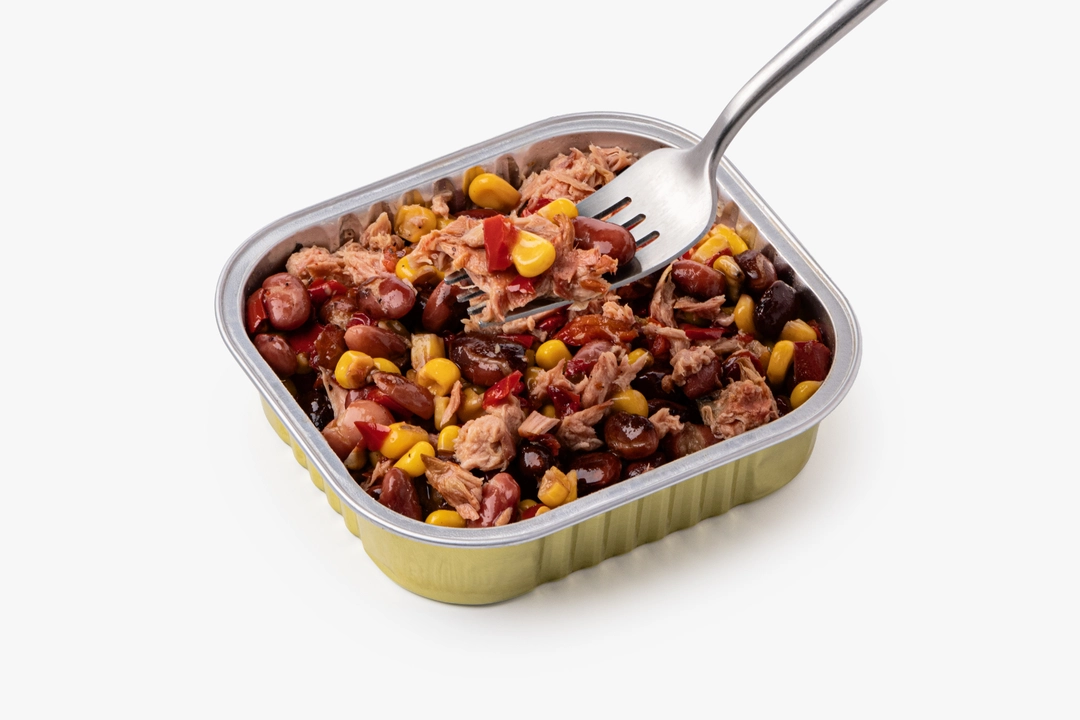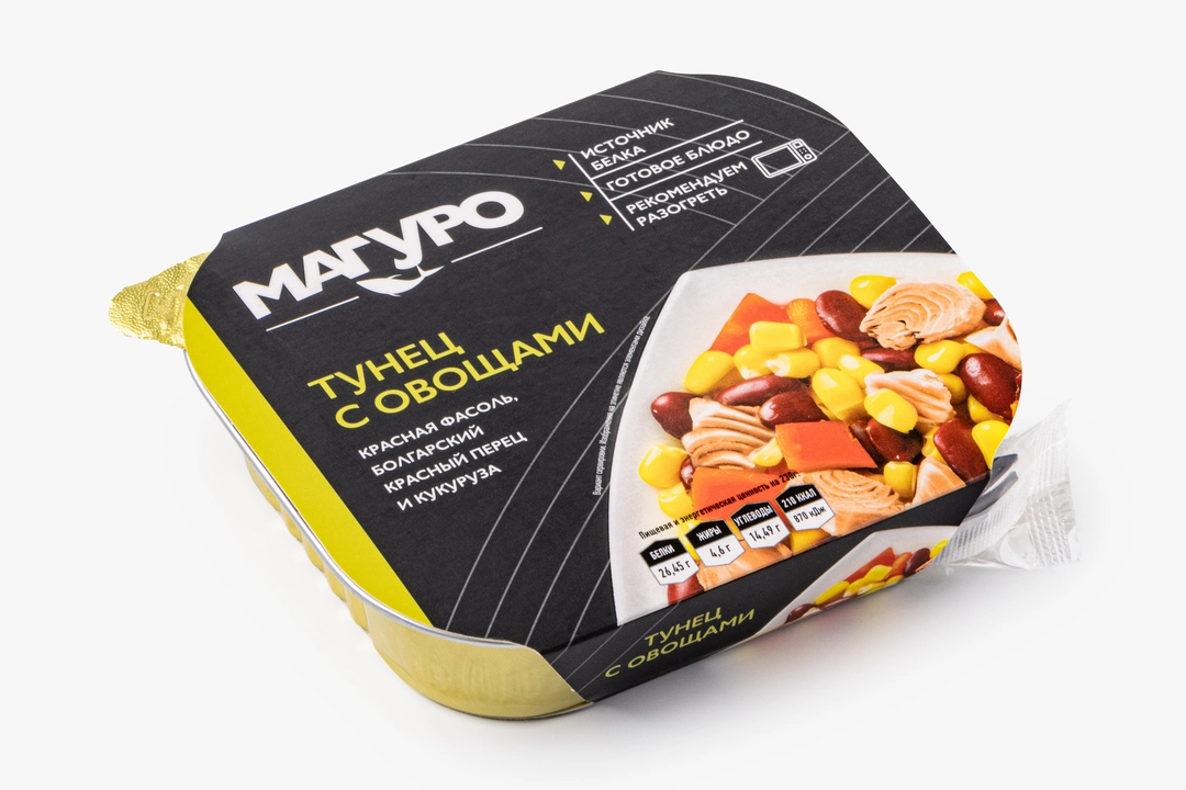 Сытное и питательное блюдо из кусочков тунца с овощами можно подать на закуску. Полосатый тунец плотный, сочный и напоминает телятину. Стерилизация сохраняет натуральный вкус ингредиентов без лишних добавок. Продукт богат белком. Закуску удобно брать с собой на дачу, на пикник, в поход или для обеда в офисе. Перед подачей рекомендуем разогреть в микроволновой печи