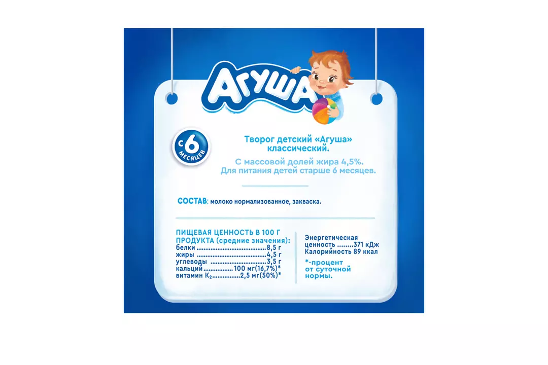 Детский творог Агуша разработан как первый кисломолочный прикорм с 6 месяцев; оптимальным считается введение творога после овощей, безмолочных каш, фруктов. Творожок Агуша - это ценный источник полноценного молочного белка, легкоусвояемого кальция и витамина К2, которые так нужны, чтобы у малыша сформировались крепкие зубы и косточки. Помимо творога Агуша предлагает кефир, ряженку, йогурт – это тоже важная часть рациона подрастающего малыша. • 100% натурально: только отборное молоко и закваска • Без добавления сахара, консервантов, сухого молока • Классический вкус • К2+Ca для крепких косточек и здорового роста Страна-производитель: Россия Возраст потребления: с 6 месяцев