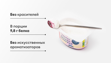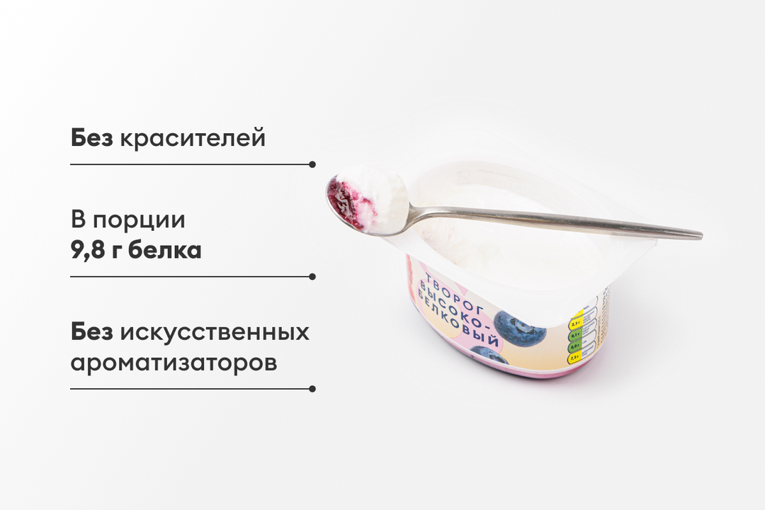 В этом твороге содержание белка выше, чем в других вариантах мягкого творога: 9,8 г на порцию 125 г. Для вкуса добавляем натуральный ягодный наполнитель из малины и черники, а не искусственный ароматизатор. Не используем красителей