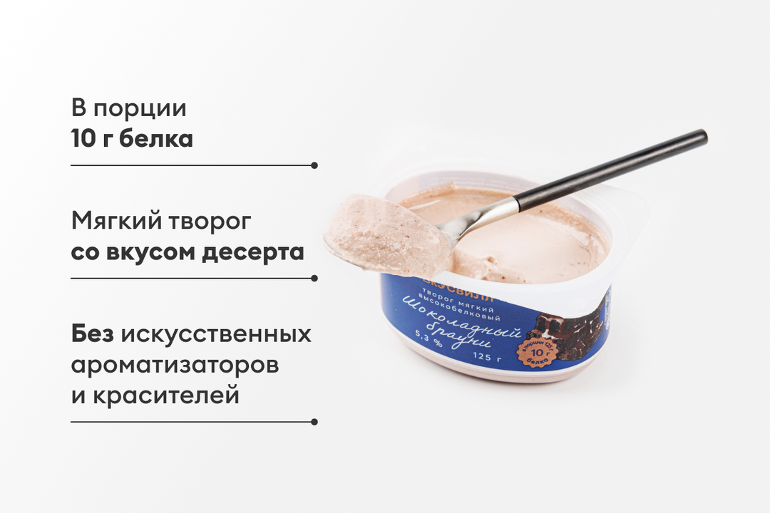 В этом твороге содержание белка выше, чем в других вариантах мягкого творога: 10 г на порцию 125 г. А ещё у него десертный вкус шоколадного брауни. Состав проверен: нет искусственных ароматизаторов и красителей