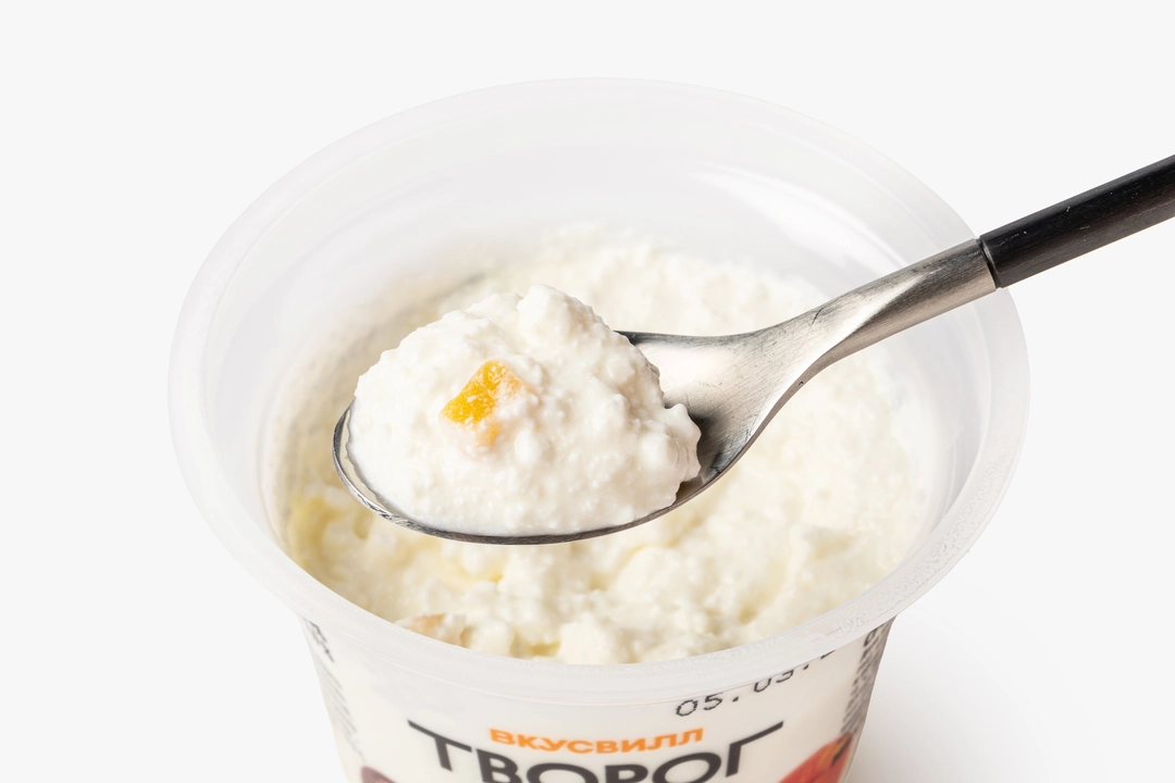Творог приготовлен из цельного обезжиренного коровьего молока и пастеризованных сливок, в нём натуральный фруктовый наполнитель из кусочков персика, концентрированного сока персика и маракуйи