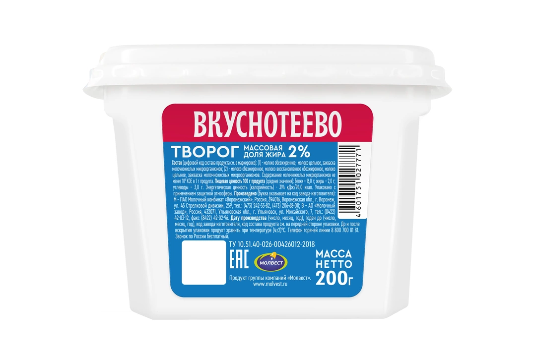 Творог — идентичен деревенскому творогу по вкусу и консистенции, а по чистоте намного превосходит его благодаря ультрасовременной линии по производству творога. Творог производится из натурального молока с собственных ферм, сквашенного натуральными заквасками, поэтому он необыкновенно вкусный и полезный. Рассыпчатая консистенция творога позволяет использовать его как для классических творожных блюд (сырников, ватрушек, вареников и блинчиков), так и употреблять его в чистом виде или с добавлением сметаны, варенья, джема. Страна-производитель Россия