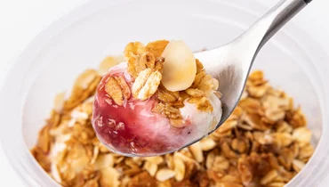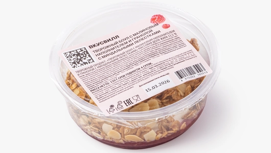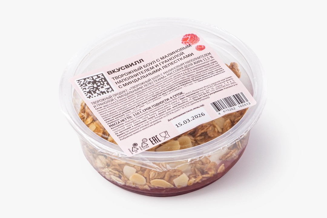 Творожный завтрак с малиновым слоем и гранолой — запечённой рассыпчатой смесью из овсяных хлопьев с миндальными лепестками. Основа из творога и сметаны получается мягкой и кремовой. Малиновый слой добавляет ягодную кислинку и лёгкую сладость, а гранола с мёдом и миндалём даёт хрустящий акцент. Сочетание нежной творожной основы, ягод и рассыпчатых хлопьев делает блюдо подходящим для завтрака или перекуса. Массовая доля жира творожной части 11,5%
