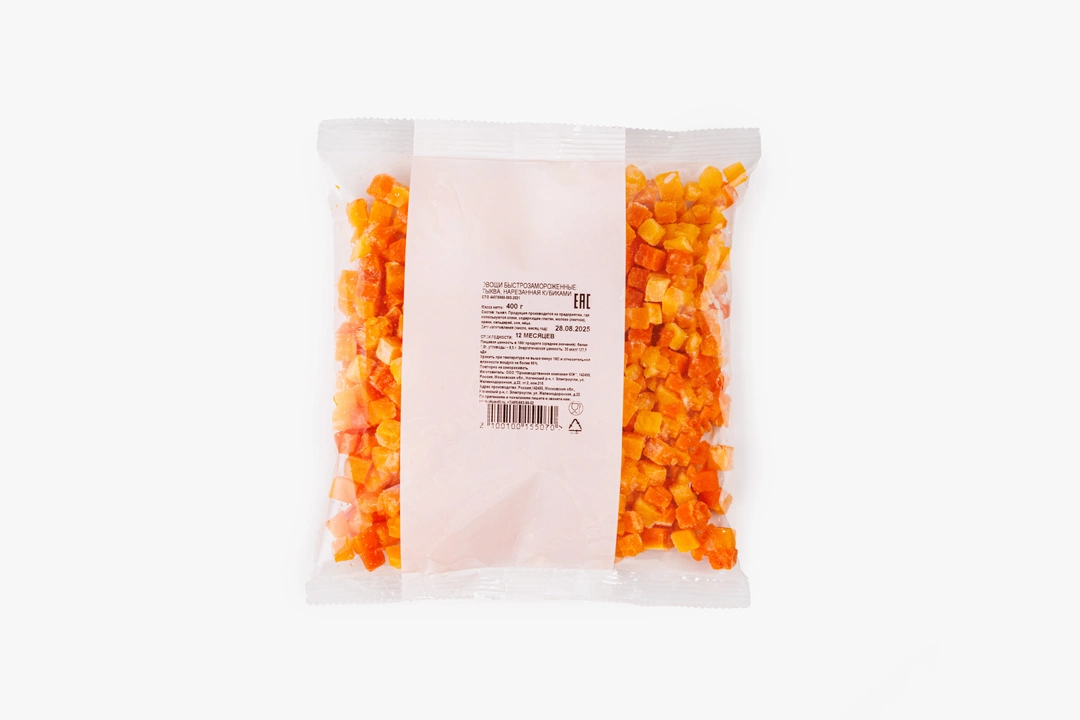 Замороженный продукт. Свежая сладкая тыква, нарезанная аккуратными маленькими кубиками. Можно добавить в суп, салат или пассировку, использовать как начинку или потушить для жаркого, сделать из такой тыквы десерт или соус. Быстро и удобно!