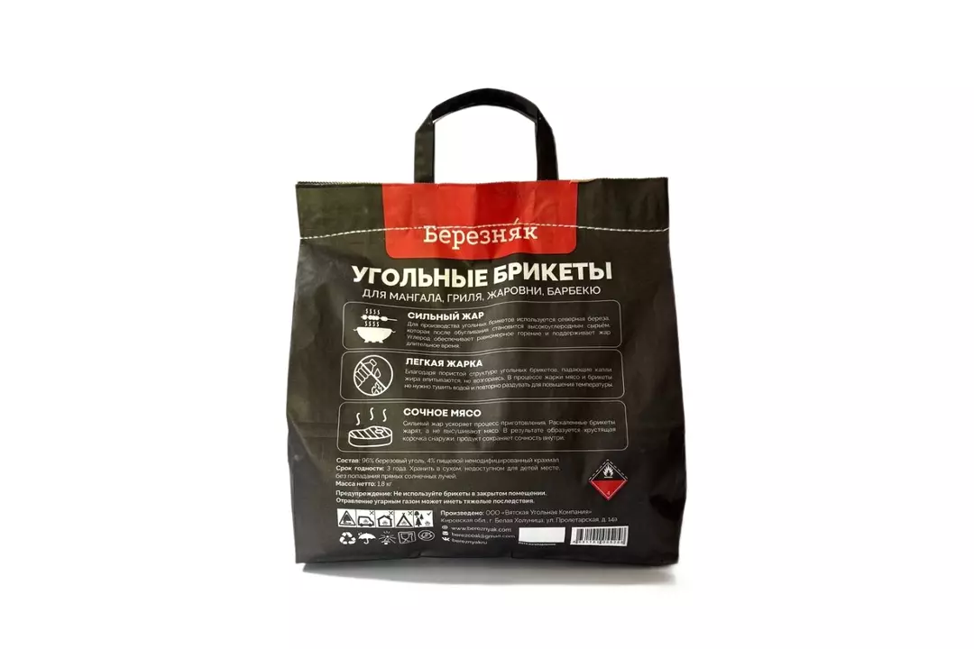 Угольные брикеты для гриля Березняк имеют экологически чистый состав - без химических добавок и каменного угля. Брикеты сухие, легкие и объемные, горят без едкого запаха и дыма. Пакет брикетов 1,8 кг заменяет 3 кг угля. Угольные брикеты Березняк очень пористые, впитывают капли жира - мясо не горит, его не нужно тушить водой. Брикеты Березняк легко разжигаются, готовы к жарке уже через 10-15 минут. Максимальная рабочая температура 450-500'C держится на протяжении 2-х часов - ускоряет приготовление, сохраняет сочность мяса и овощей. В процессе жарки вы почувствуете аромат печеного картофеля, а не запах химии. Брикеты можно использовать повторно. Для этого после жарки залейте брикеты водой, а спустя время, по необходимости, разожгите снова. Стартер для розжига не обязателен. Размер пакета 300*320*110мм Страна производитель-Россия